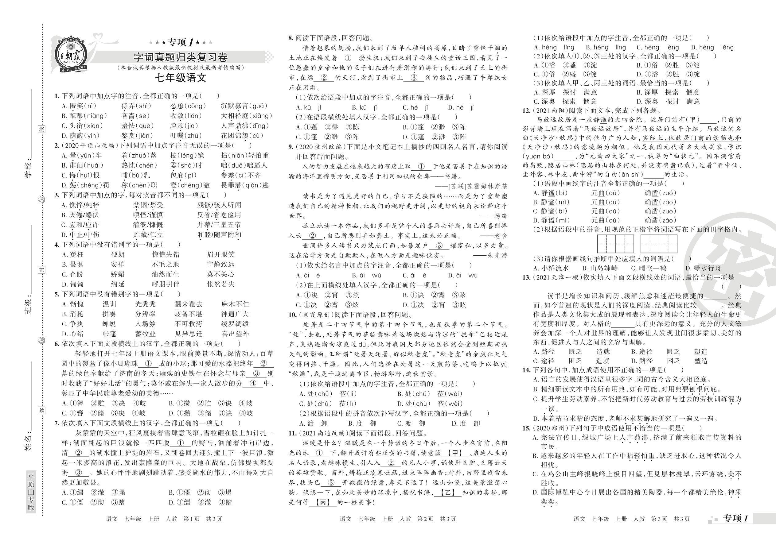 王朝霞期末专项卷——字词真题归类复习卷七年级上册语文(人教版)_R211208150146416【1】