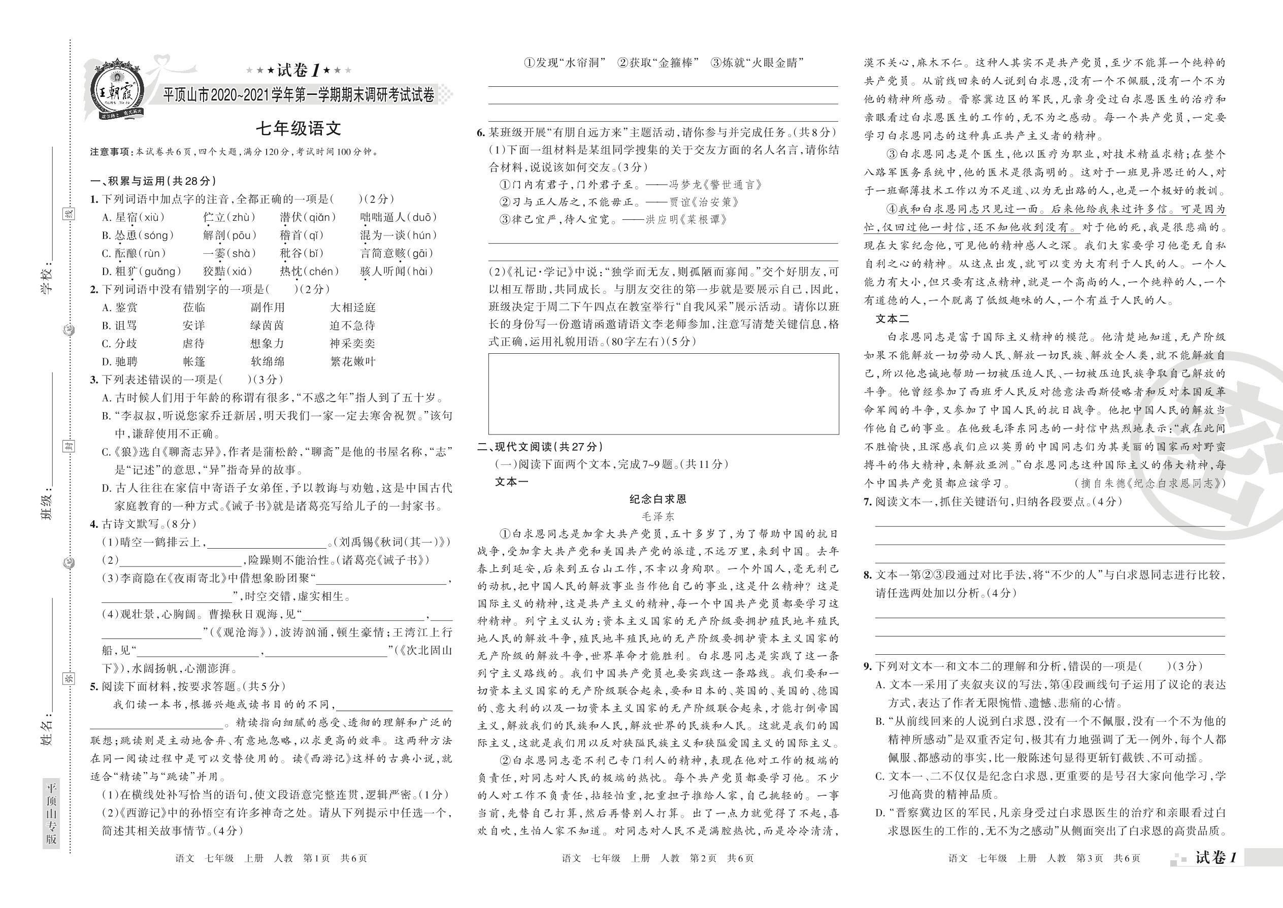 平顶山市2020~2021学年第一学期期末调研考试试卷七年级语文(人教版)【1】