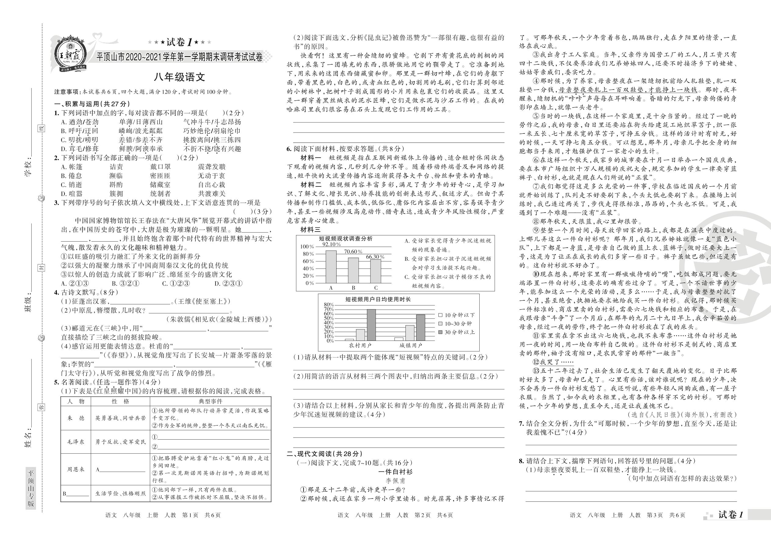 平顶山市2020~2021学年第一学期期末调研考试试卷八年级语文(人教版)【1】