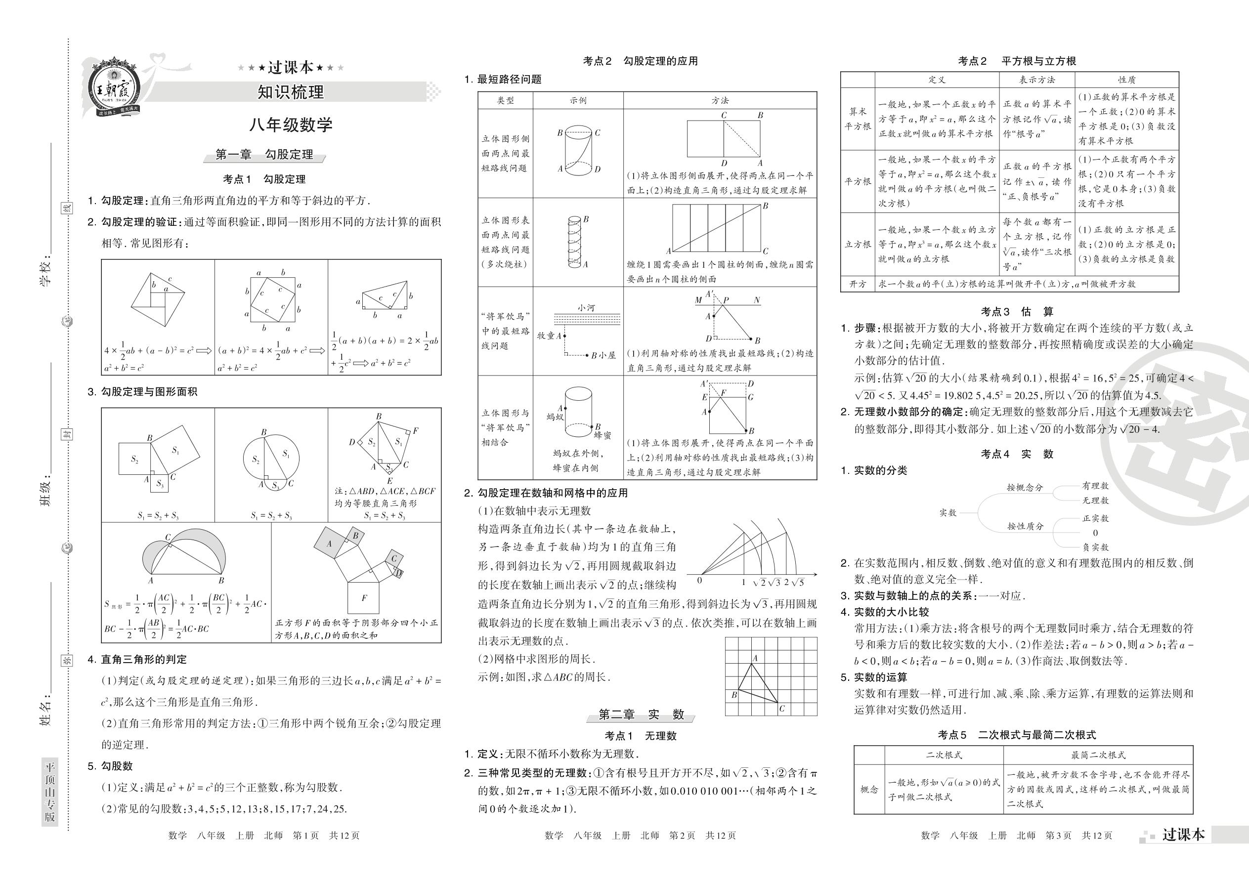王朝霞期末知识梳理八年级上册数学(北师版)