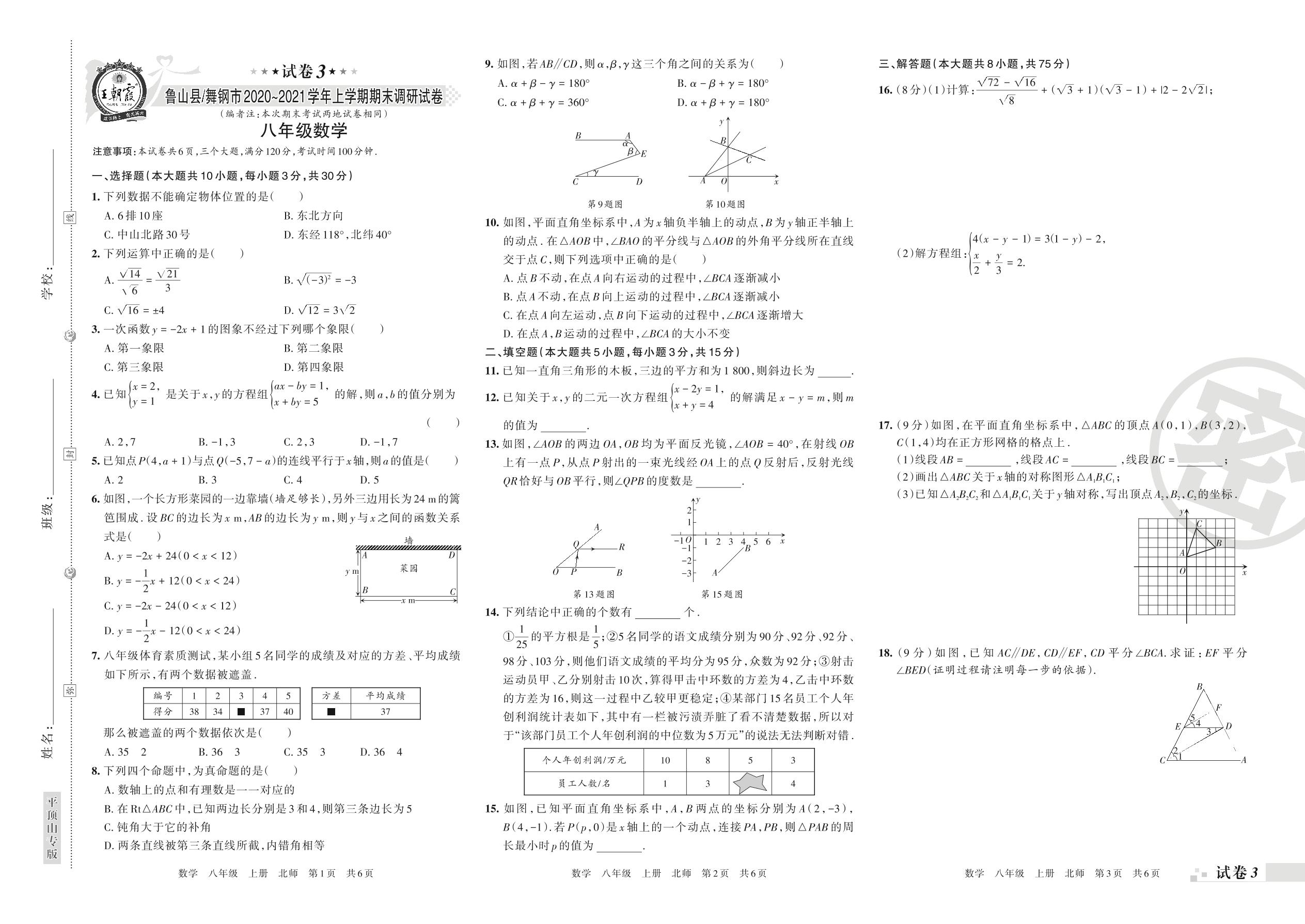 鲁山县、舞钢市2020~2021学年上学期期末调研试卷八年级数学(北师版)【3】