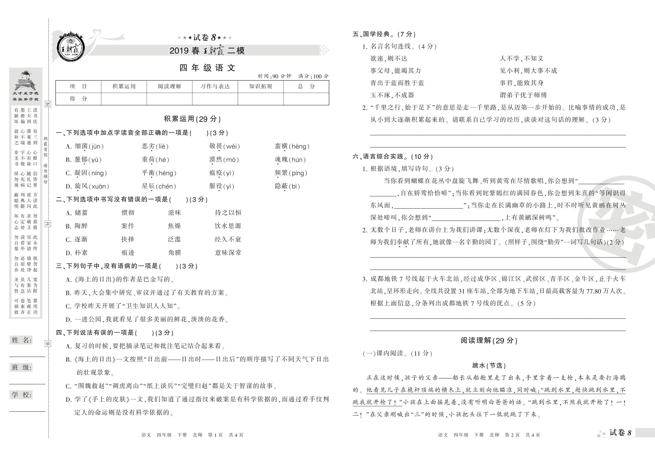 王朝霞期末模拟卷四年级下册语文(北师版)【8】
