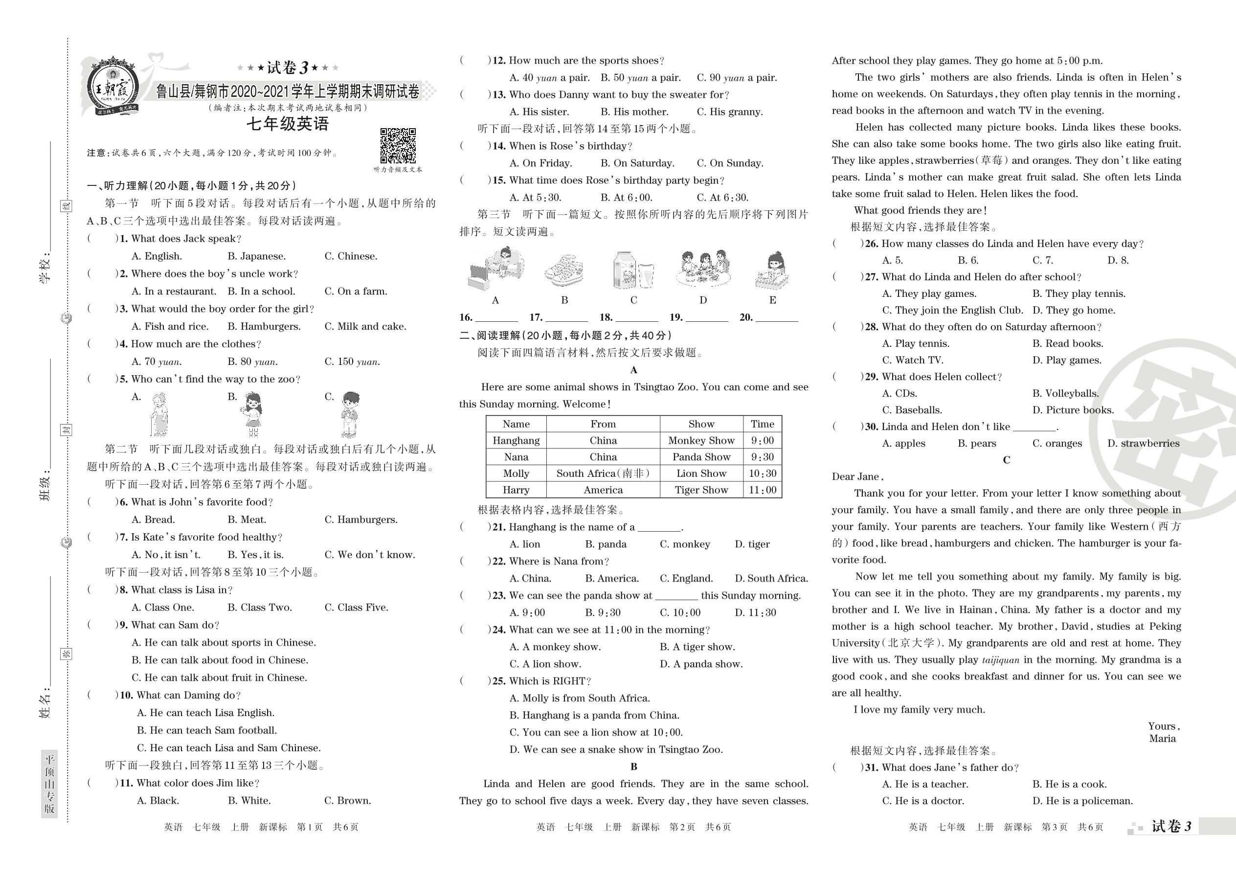 鲁山县、舞钢市2020~2021学年上学期期末调研试卷七年级英语(新课标)【3】
