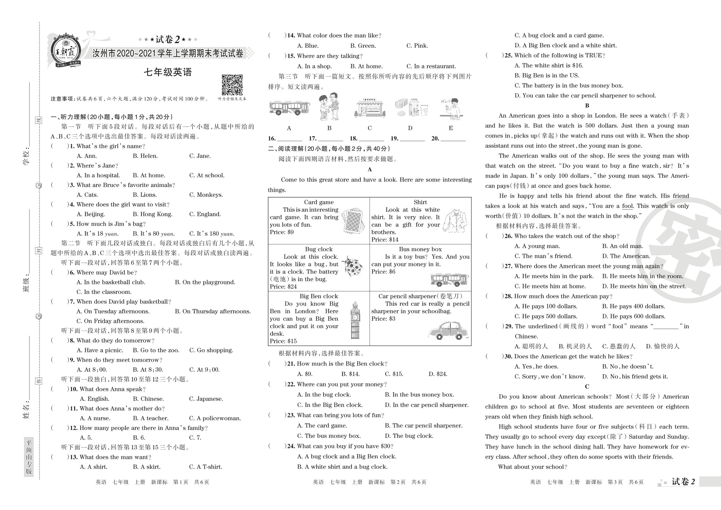 汝州市2020~2021学年上学期期末考试试卷七年级英语(新课标)【2】