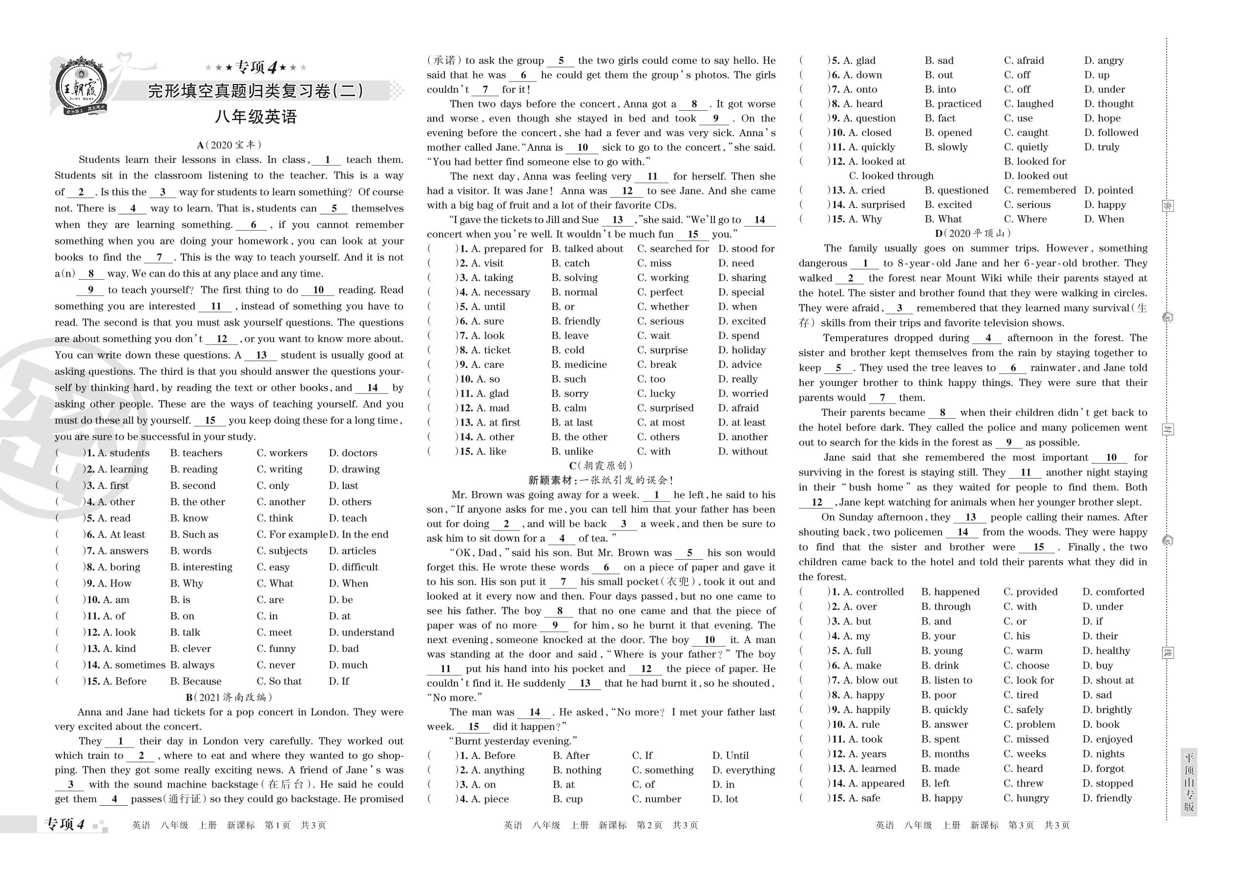 王朝霞期末专项卷——完形填空真题归类复习卷(二)八年级上册英语(新课标)【4】