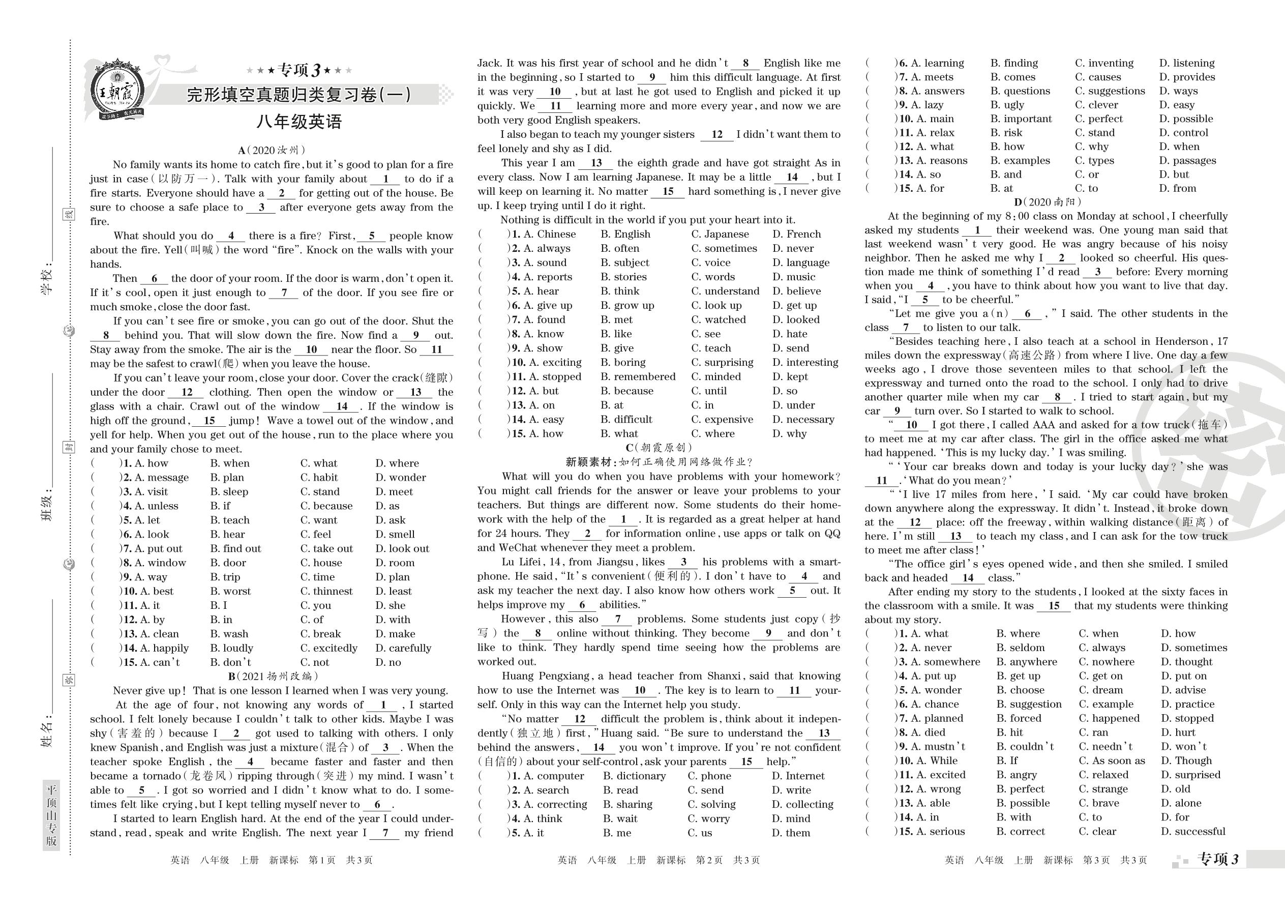 王朝霞期末专项卷——完形填空真题归类复习卷(一)八年级上册英语(新课标)【3】