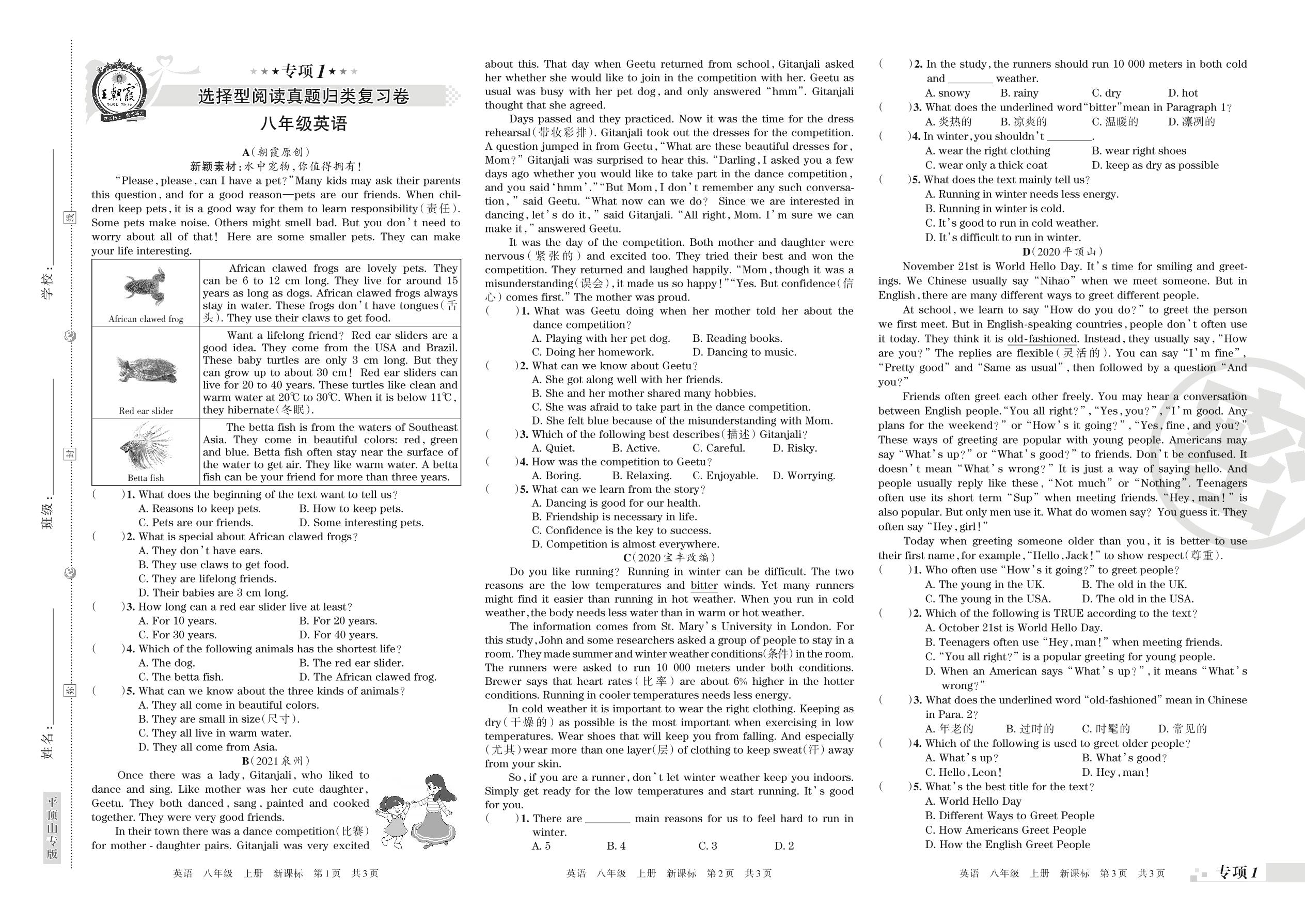 王朝霞期末专项卷——选择型阅读真题归类复习卷八年级上册英语(新课标)【1】