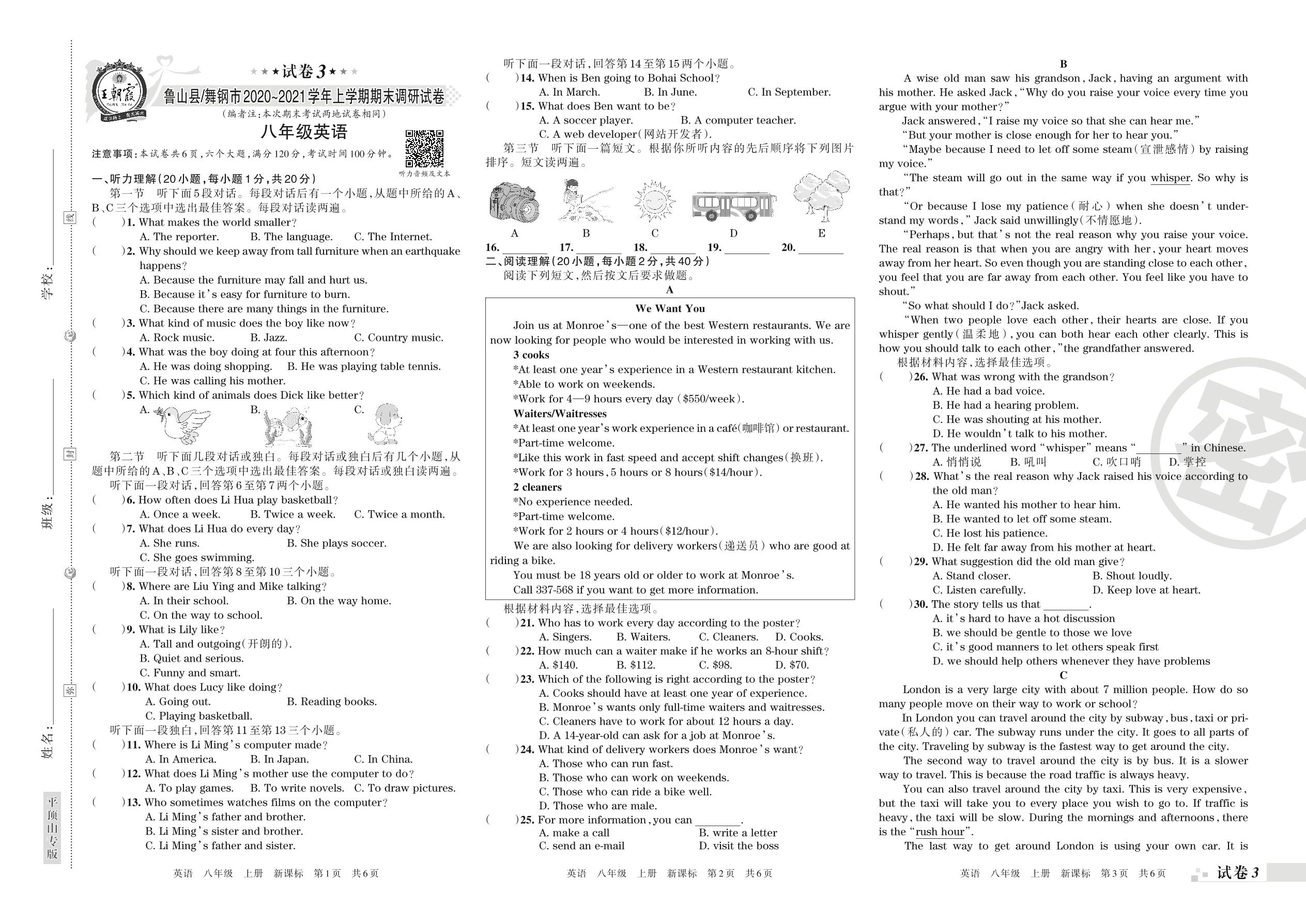 鲁山县、舞钢市2020~2021学年上学期期末调研试卷八年级英语(新课标)【3】