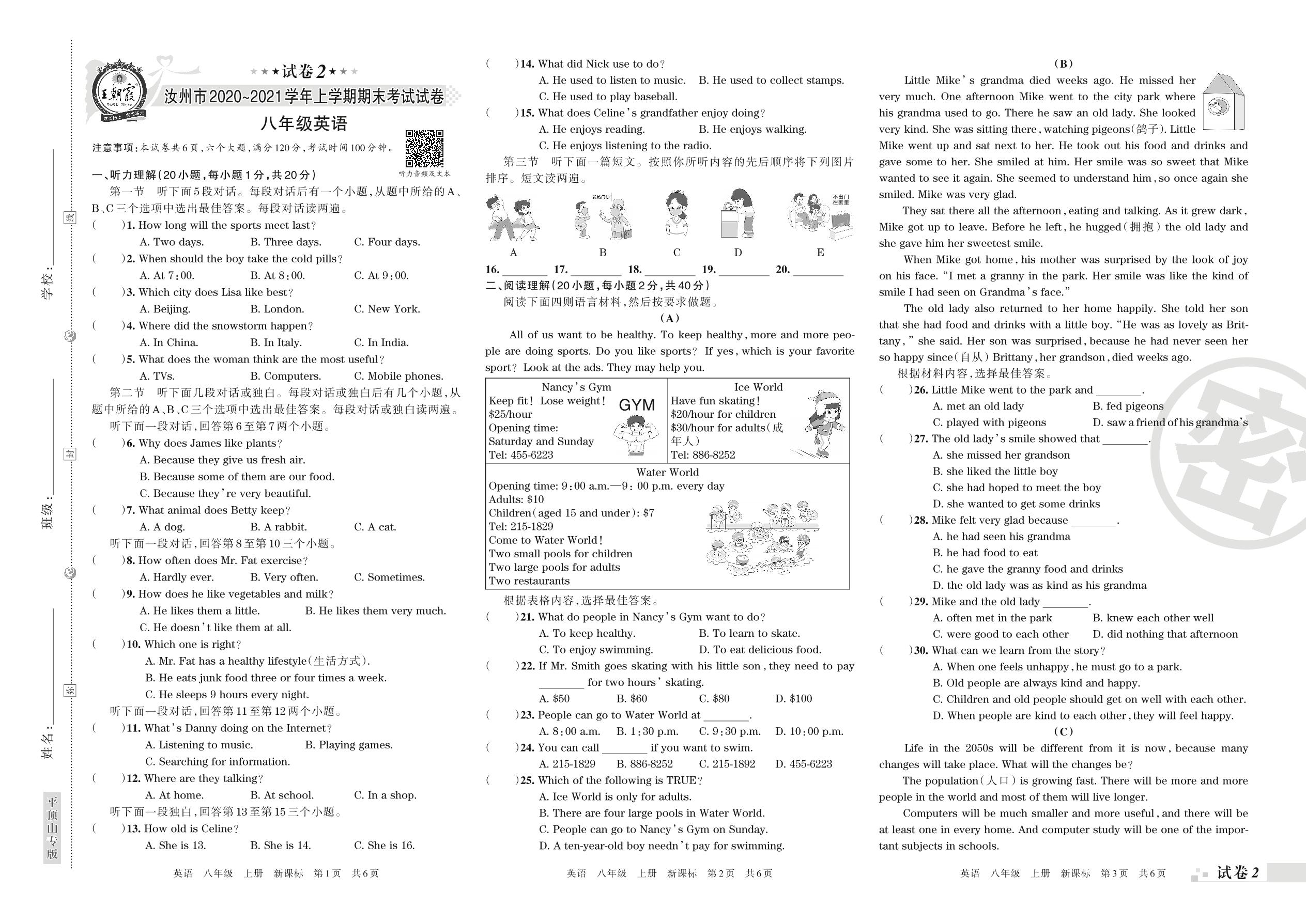 汝州市2020~2021学年上学期期末考试试卷八年级英语(新课标)【2】