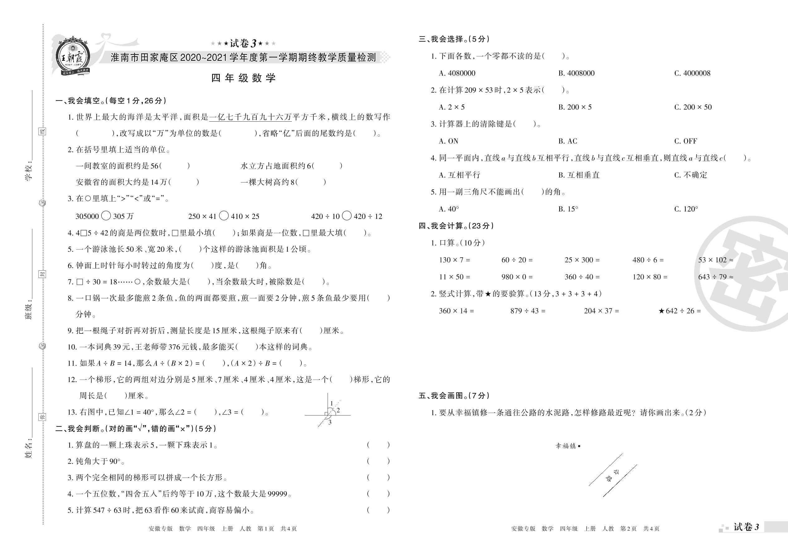 淮南市田家庵区2020~2021学年度第一学期期终教学质量检测四年级数学(人教版)【3】
