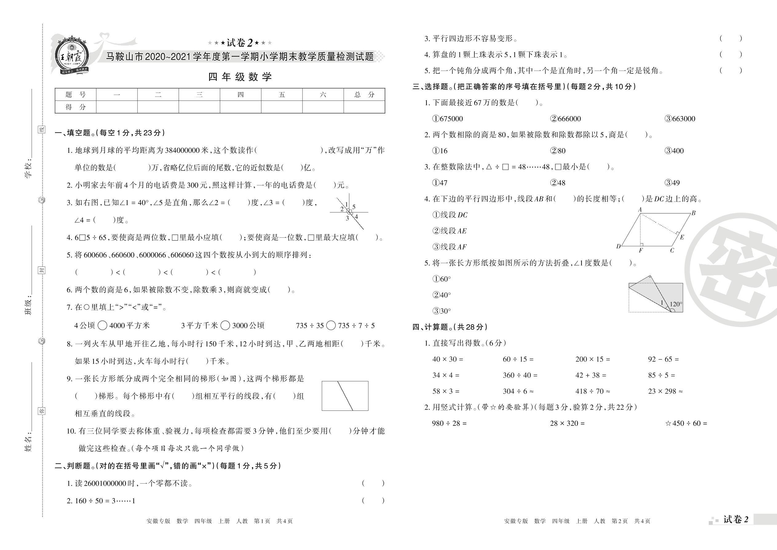 马鞍山市2020~2021学年度第一学期小学期末教学质量检测试题四年级数学(人教版)【2】