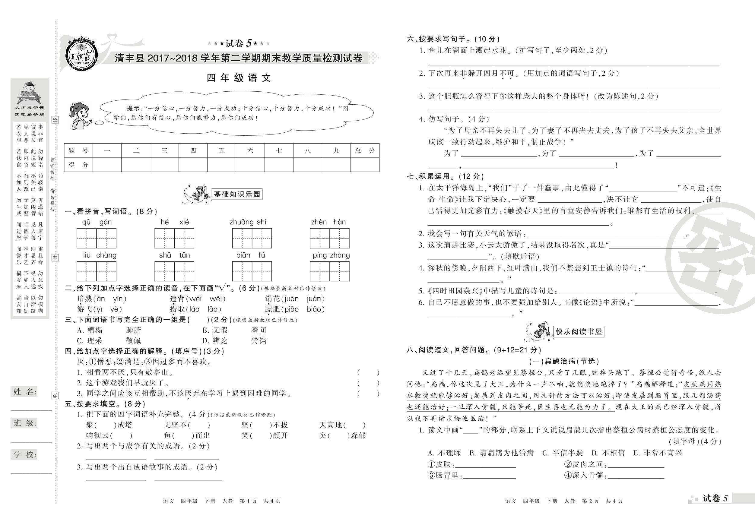 2017-2018学年第二学期濮阳市清丰县四年级语文试卷(人教版)【5】