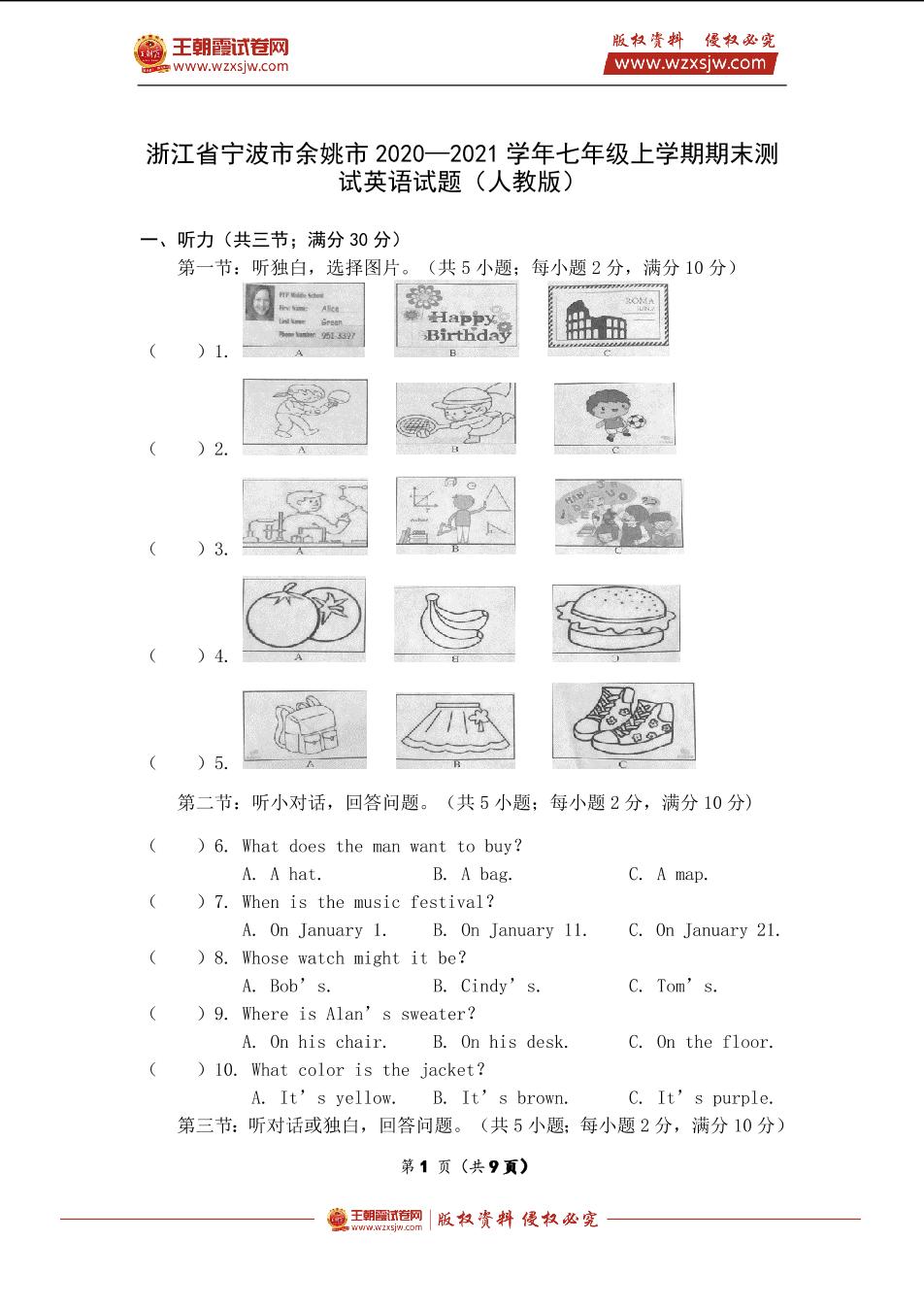 浙江省宁波市、余姚市、慈溪市2020—2021学年七年级上学期期末测试英语试题(人教版)【无听力音频】