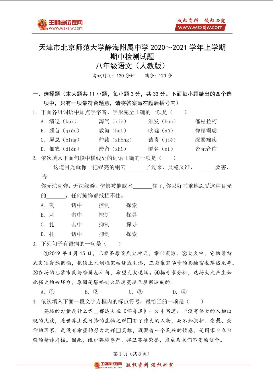 天津市北京师范大学静海附属中学2020~2021学年八年级上学期期中检测语文试题(人教版)