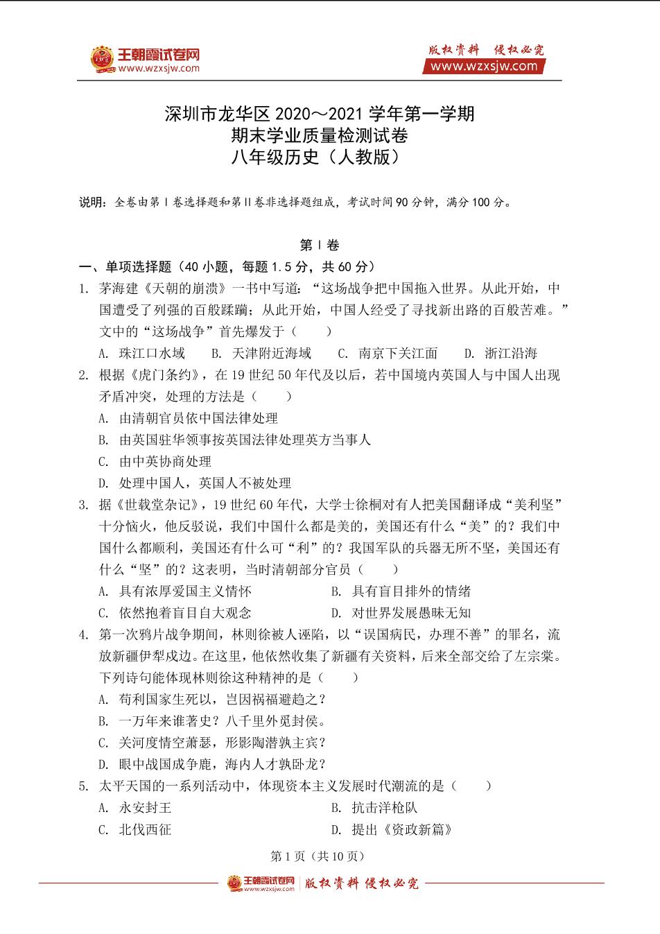 深圳市龙华区2020~2021学年八年级第一学期期末学业质量检测历史试卷(人教版) _R211210165108144
