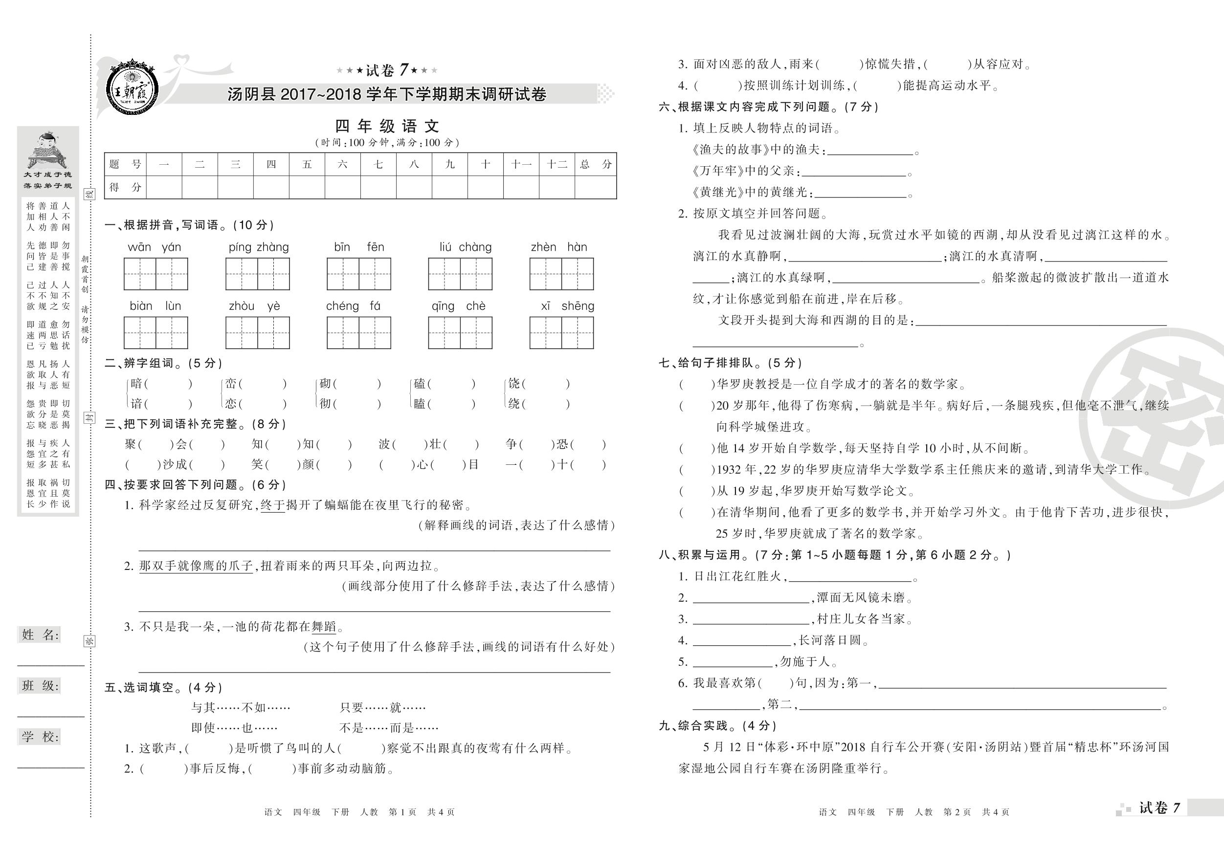 2017-2018学年第二学期安阳市汤阴县四年级语文试卷(人教版)【7】