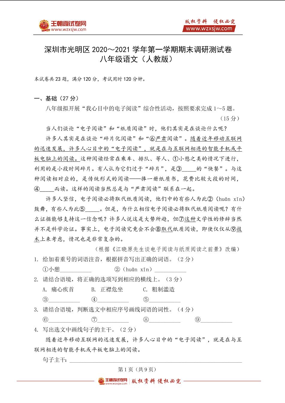 广东省深圳市光明区2020~2021学年八年级上学期期末考试语文试题(人教版)_R211210165109404