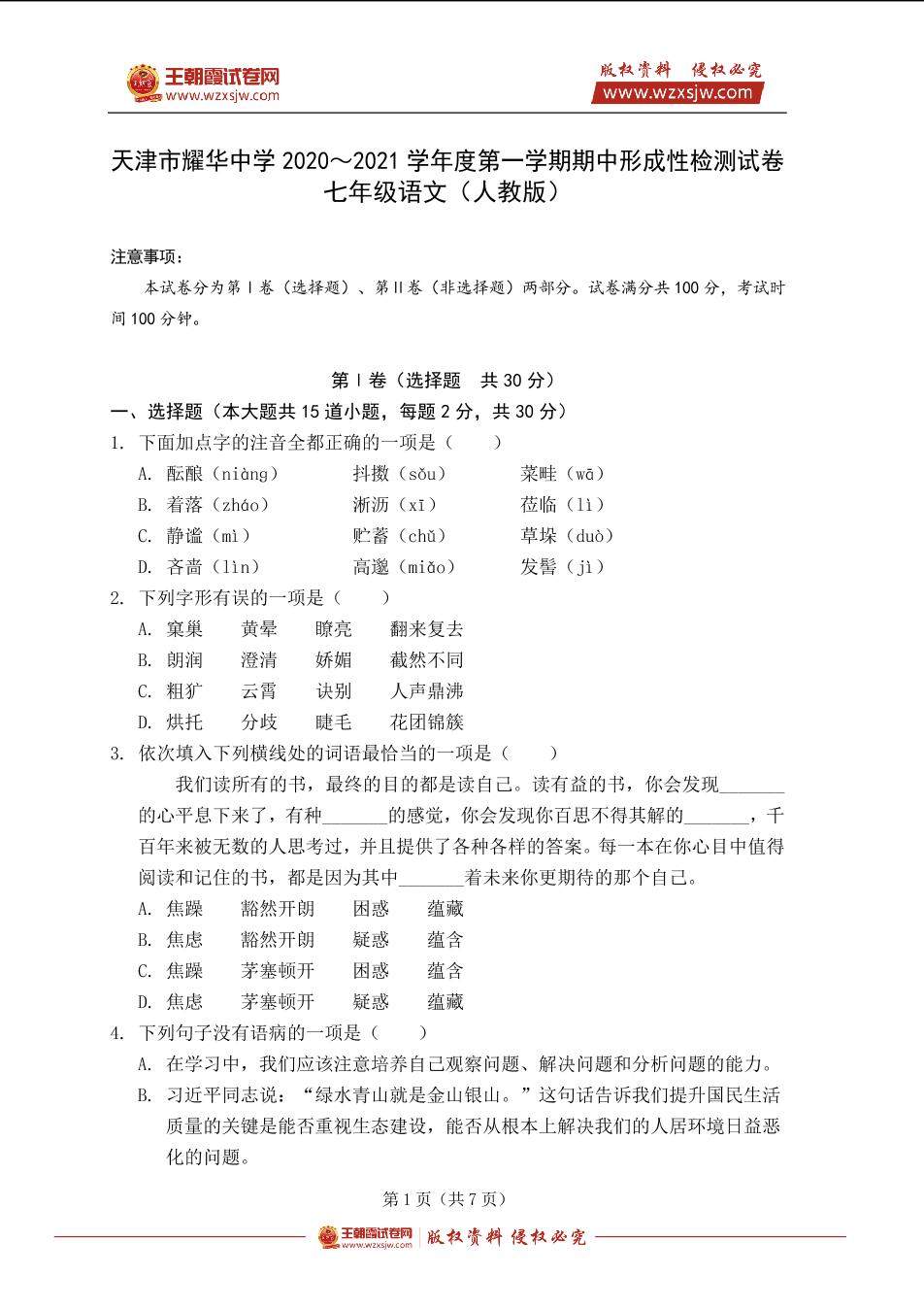 天津市耀华中学2020~2021学年度第一学期期中形成性检测试卷七年级语文(人教版)