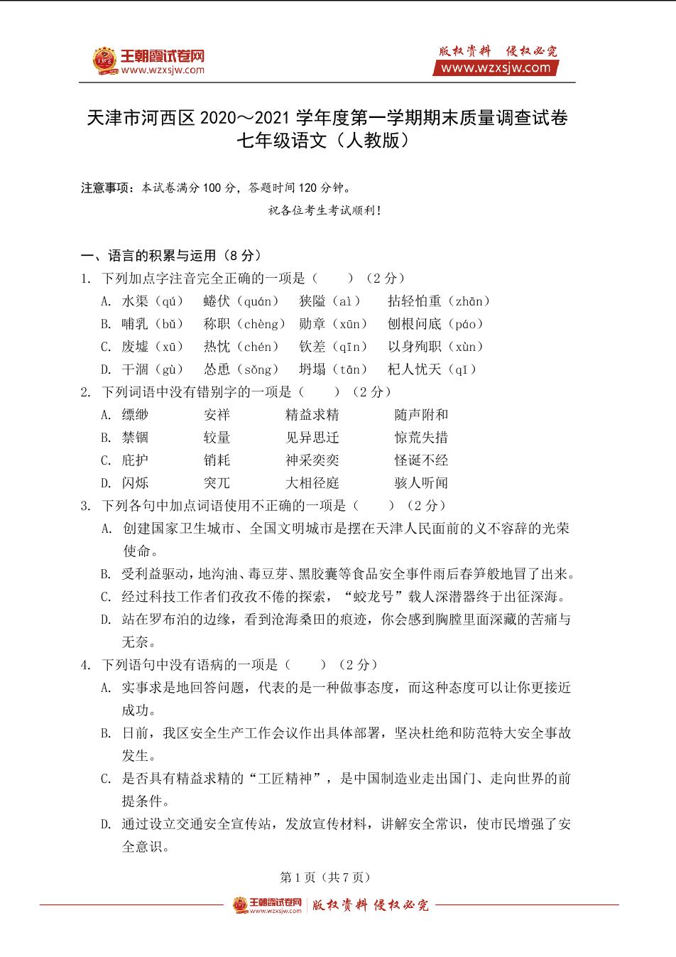 天津市河西区2020~2021学年度七年级第一学期期末质量调查语文试卷(人教版) _R211210165110729