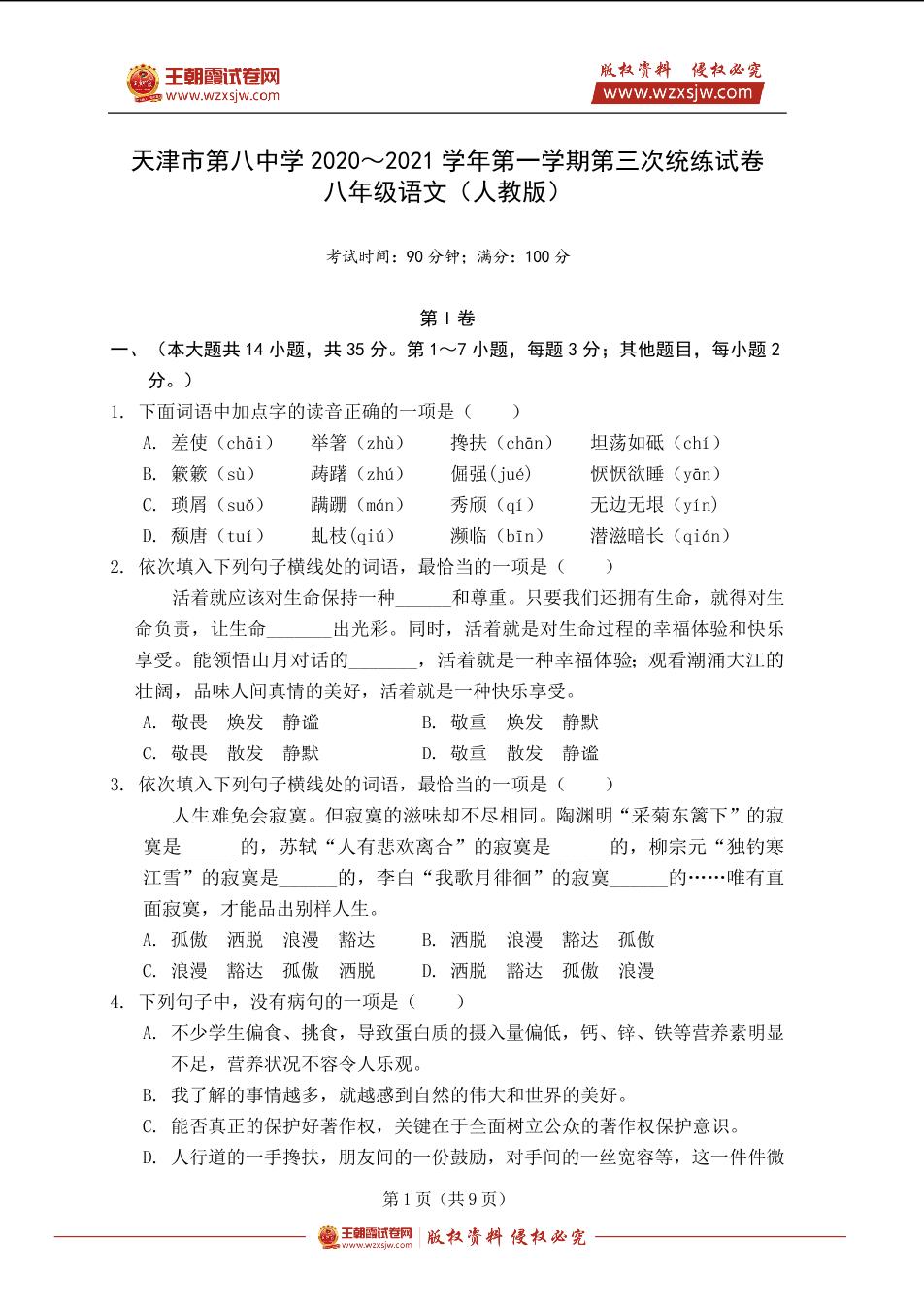 天津市第八中学2020~2021学年八年级上学期第三次统练语文试题 (人教版)_R211210165111762