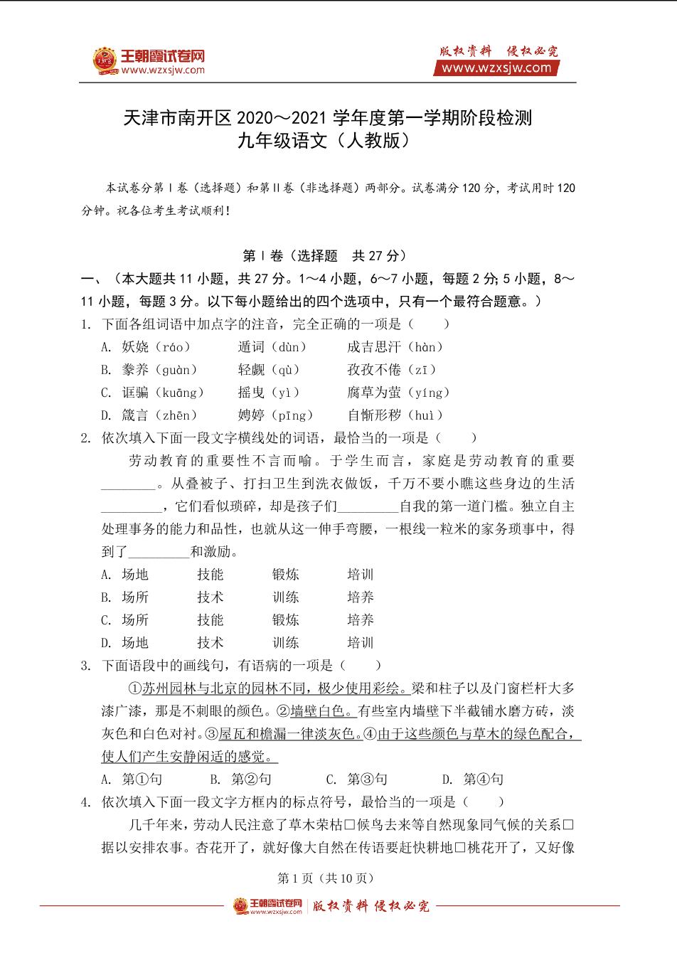 天津市南开区2020~2021学年度第一学期阶段检测九年级语文(人教版) _R211210165111497