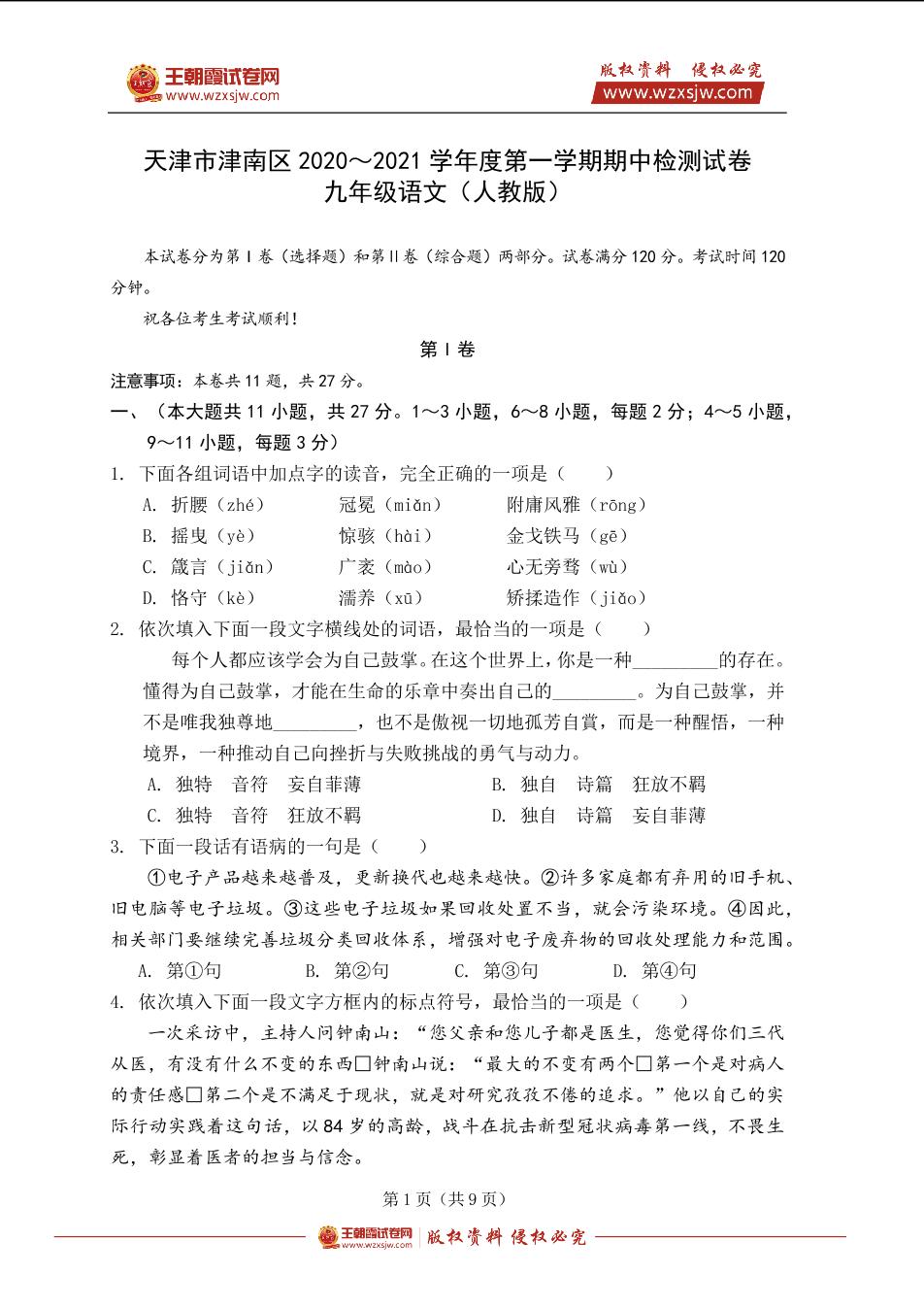 天津市津南区2020~2021学年度九年级第一学期期中检测语文试卷(人教版)