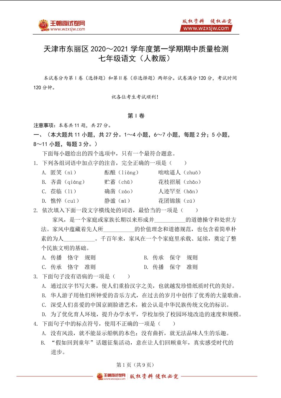 天津市东丽区2020~2021学年度第一学期七年级语文期中质量检测(人教版)