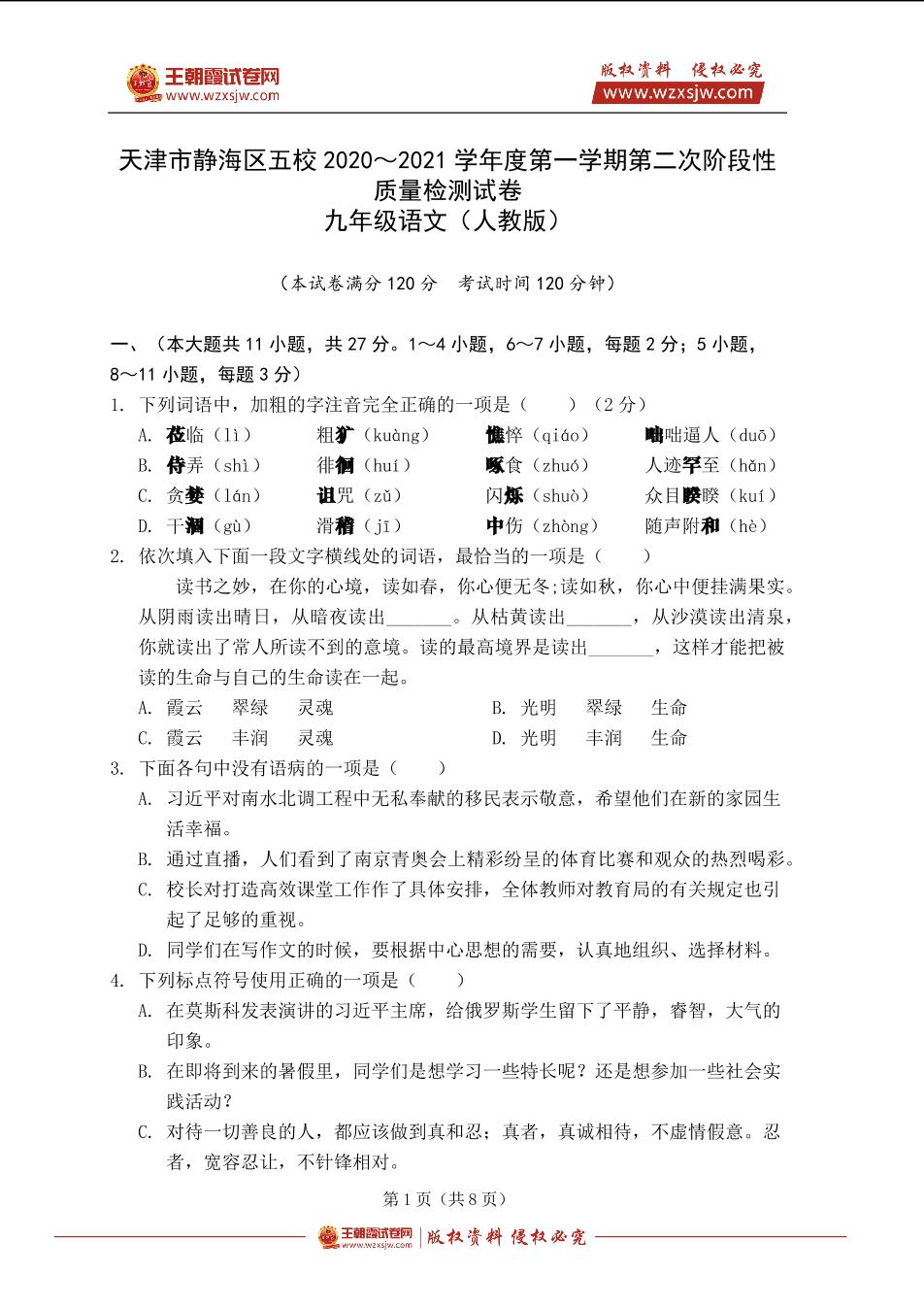 天津市静海区五校2020~2021学年度九年级第一学期第二次阶段性质量检测语文试卷(人教版) _R211210165112055