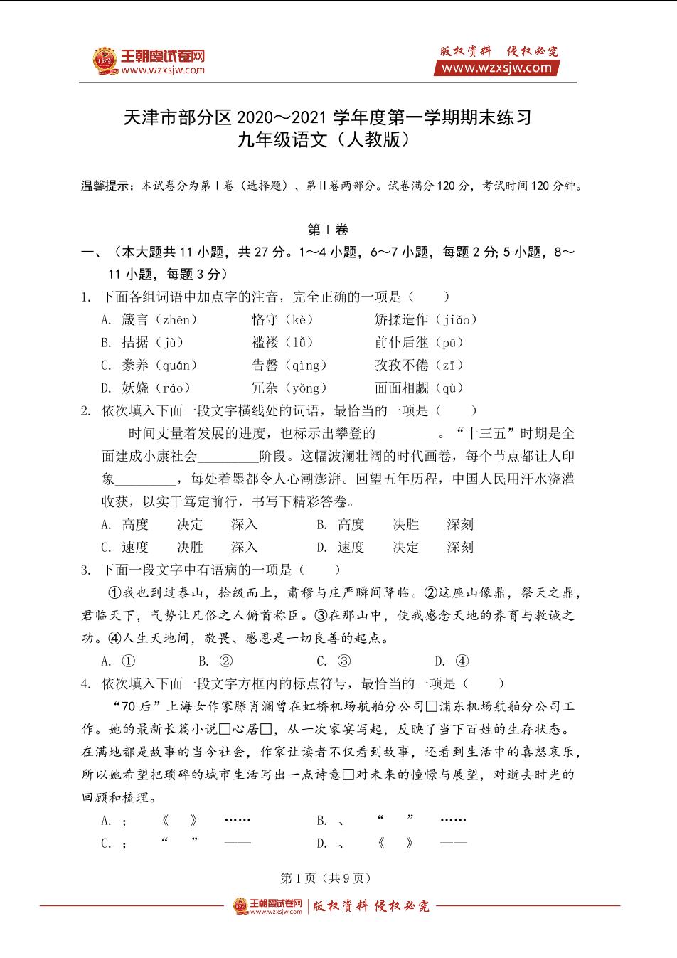 天津市部分区2020~2021学年度九年级第一学期期末语文练习试卷(人教版)_R211210165112097