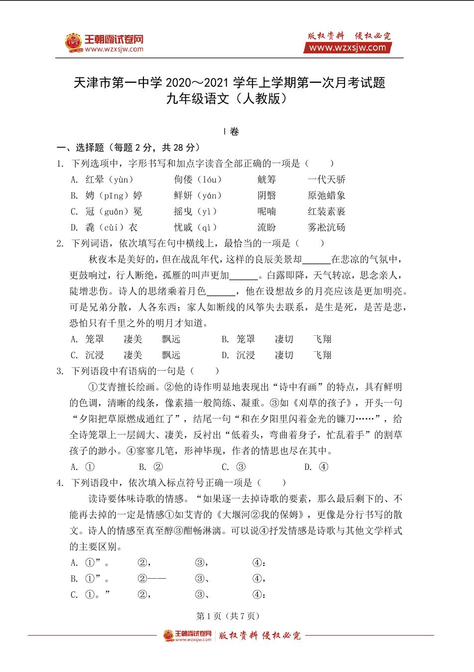 天津市第一中学2021届九年级上学期第一次月考语文试题(人教版)