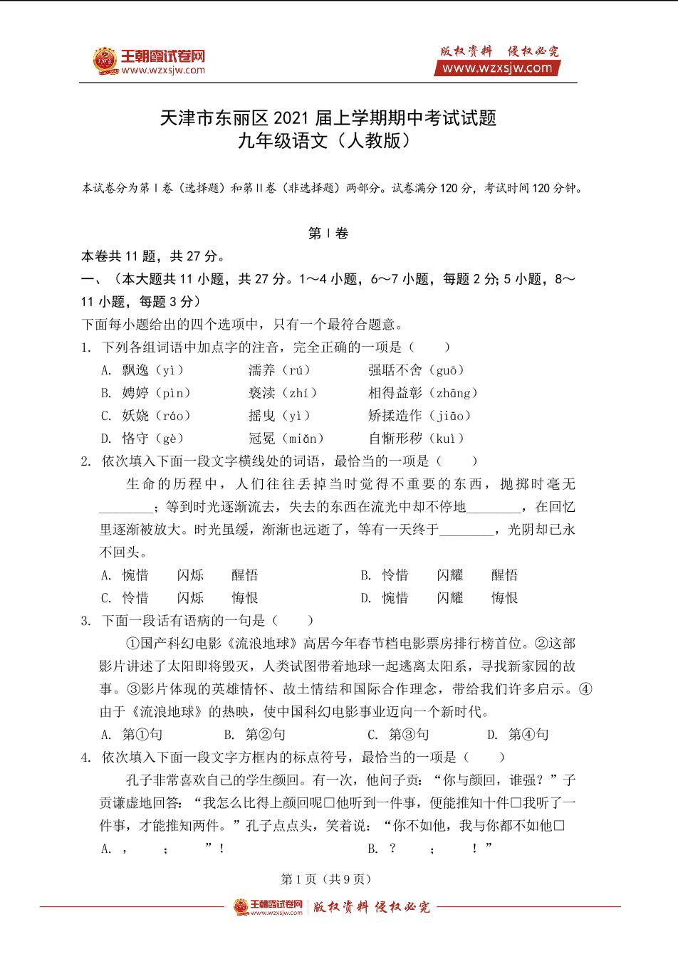 天津市东丽区2021届九年级上学期期中考试语文试题(人教版)