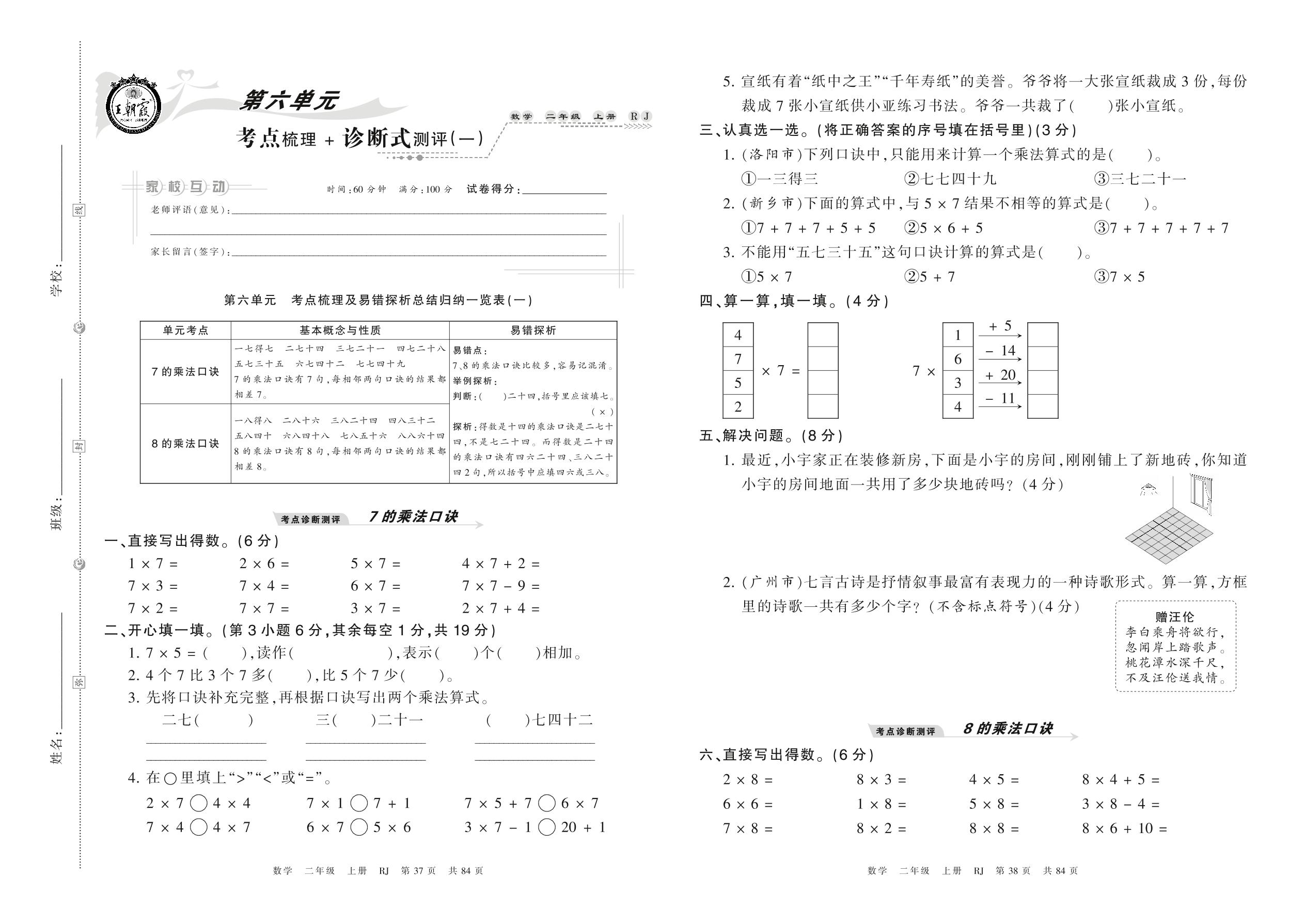 2021上册二年级数学人教版 第六单元 考点梳理+诊断式测评(一)