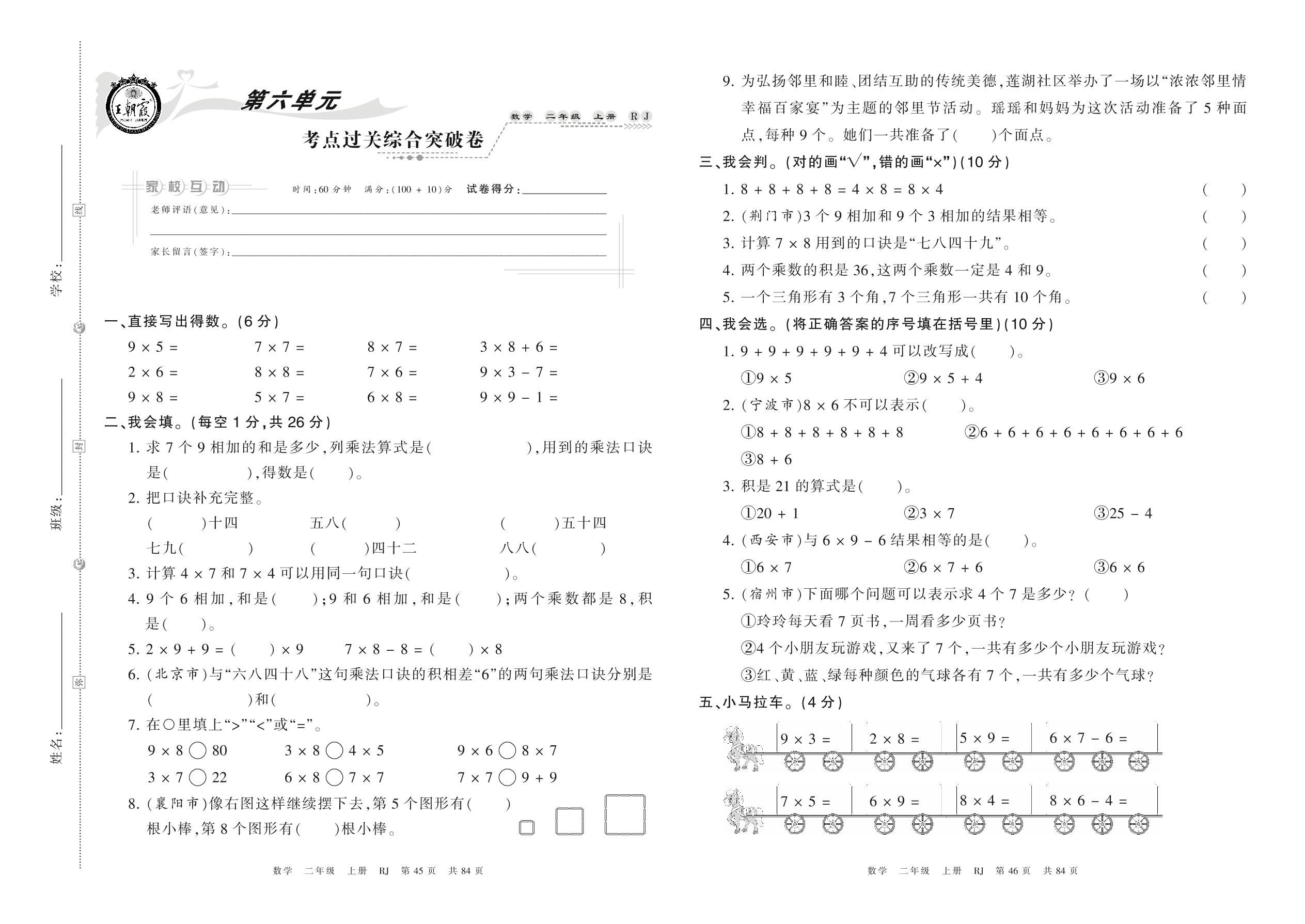2021上册二年级数学人教版 第六单元 考点过关综合突破卷