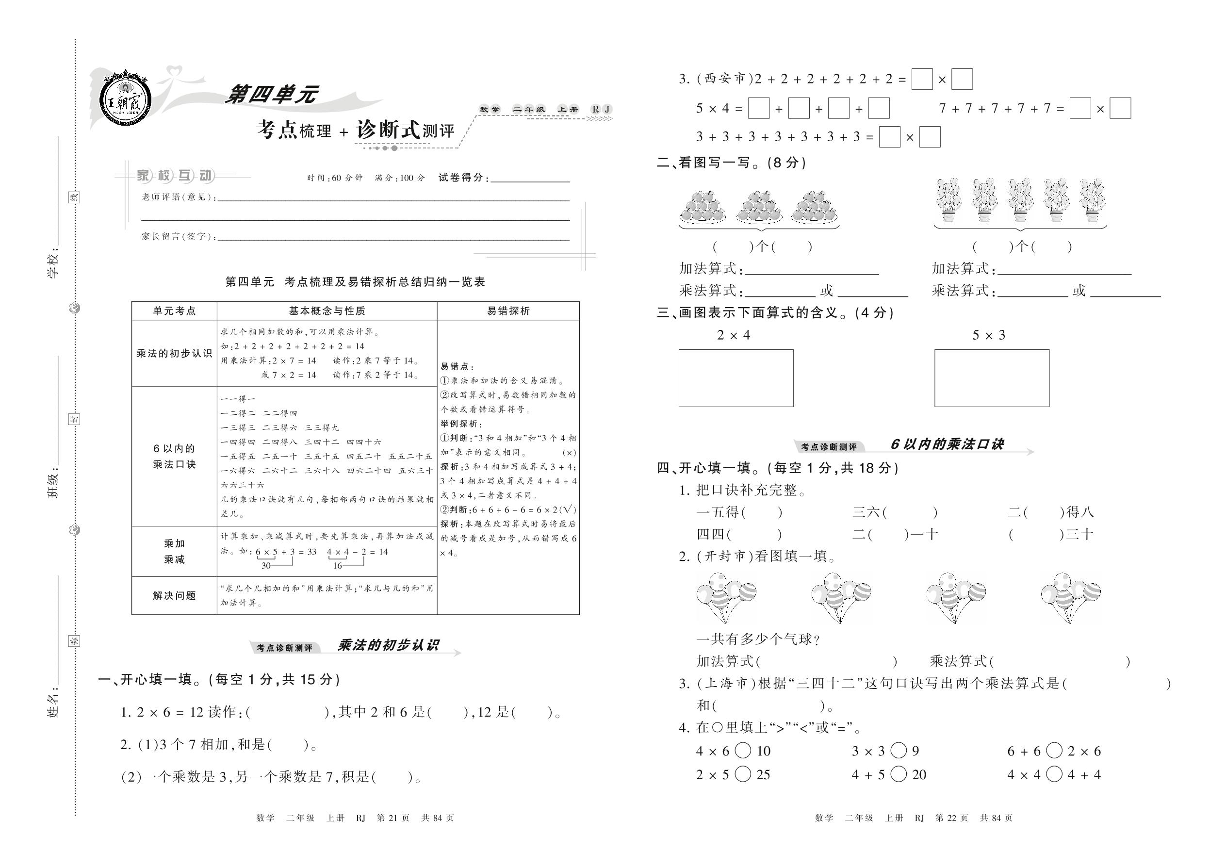 2021上册二年级数学人教版 第四单元 考点梳理+诊断式测评