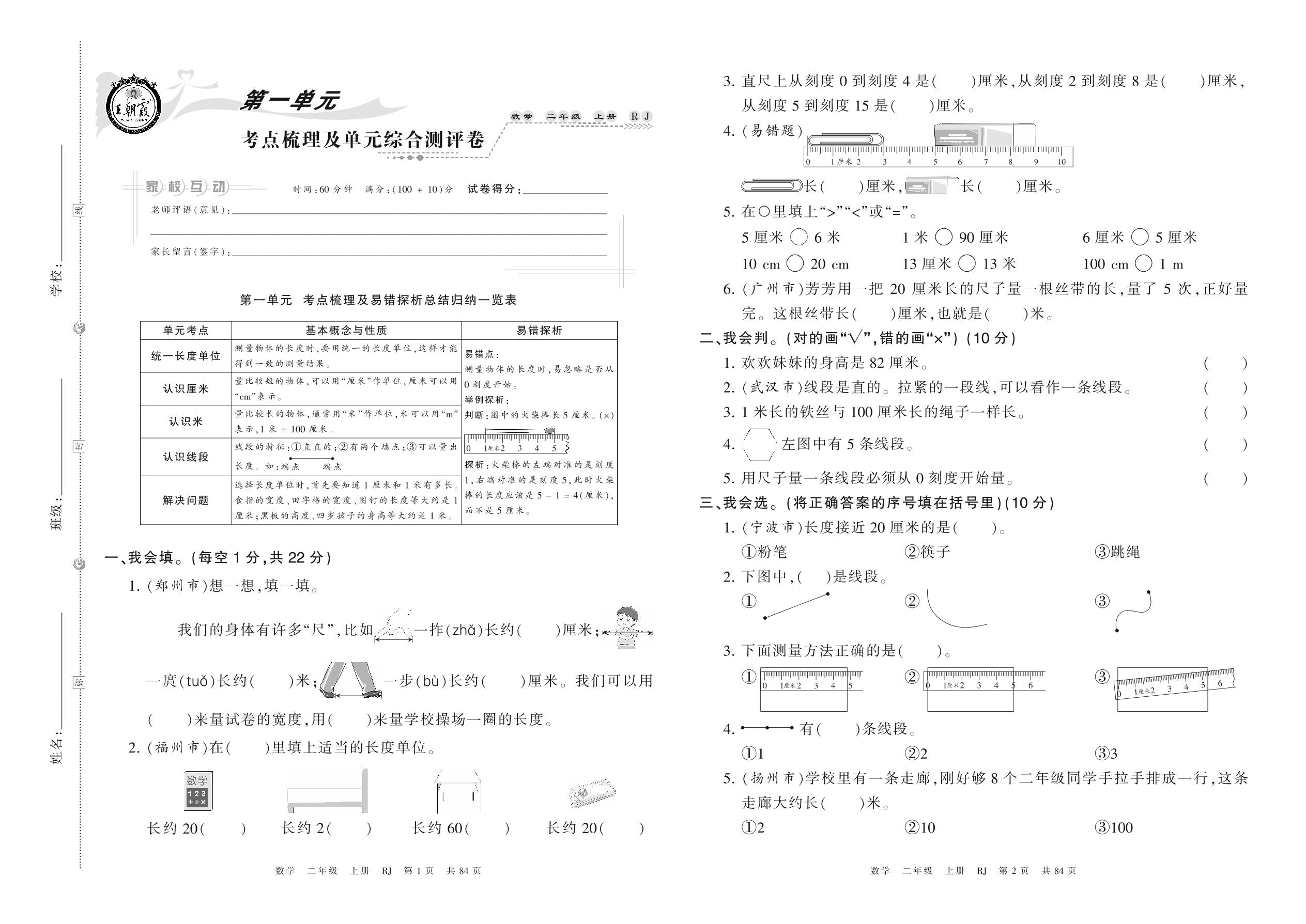 2021上册二年级数学人教版 第一单元 考点梳理及单元综合测评卷