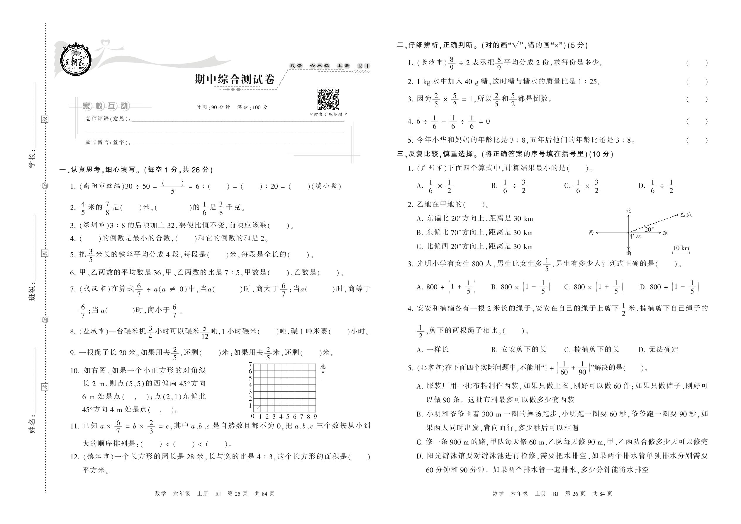 2021上册六年级数学人教版 期中综合测试卷