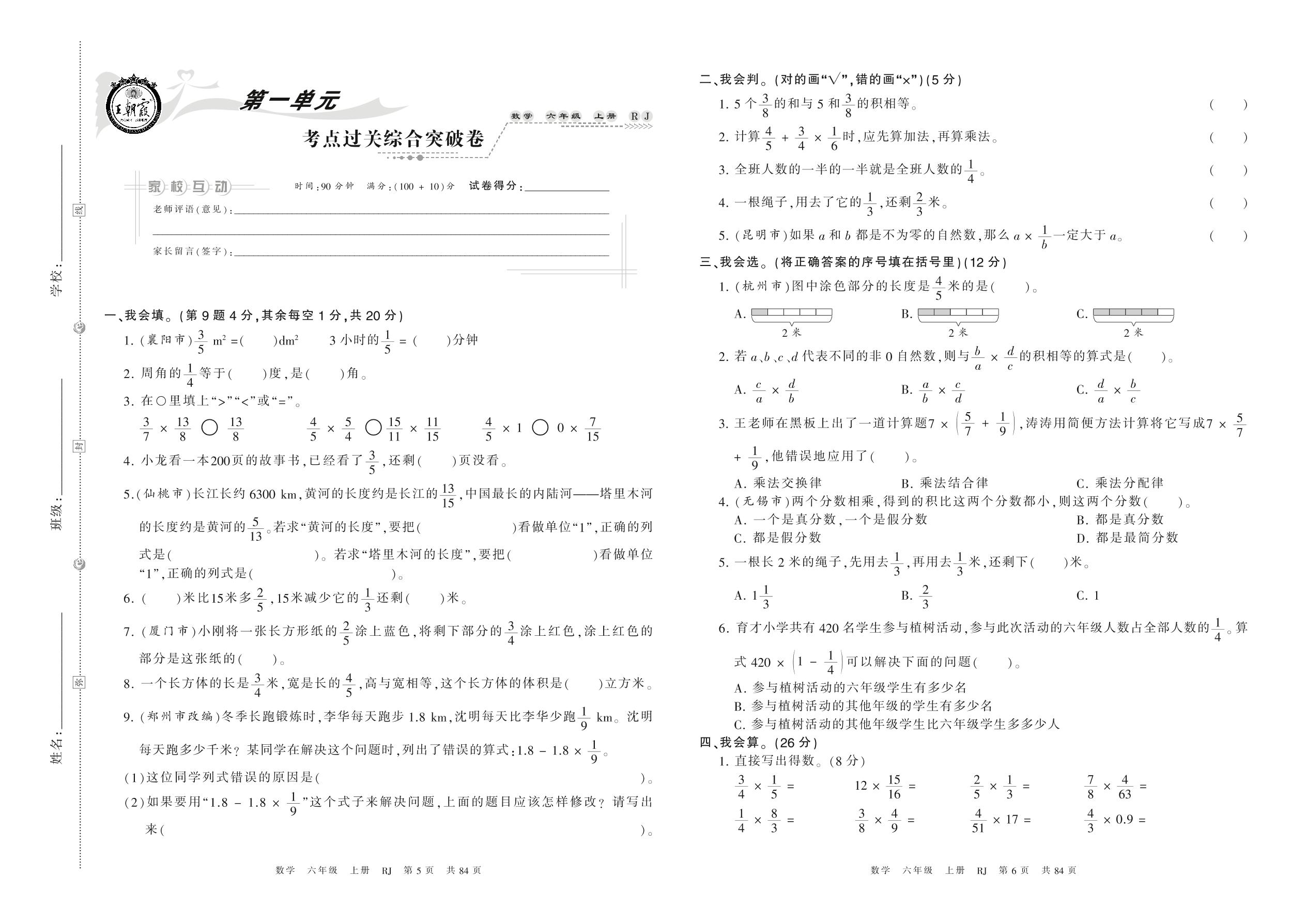 2021上册六年级数学人教版 第一单元 考点过关综合突破卷