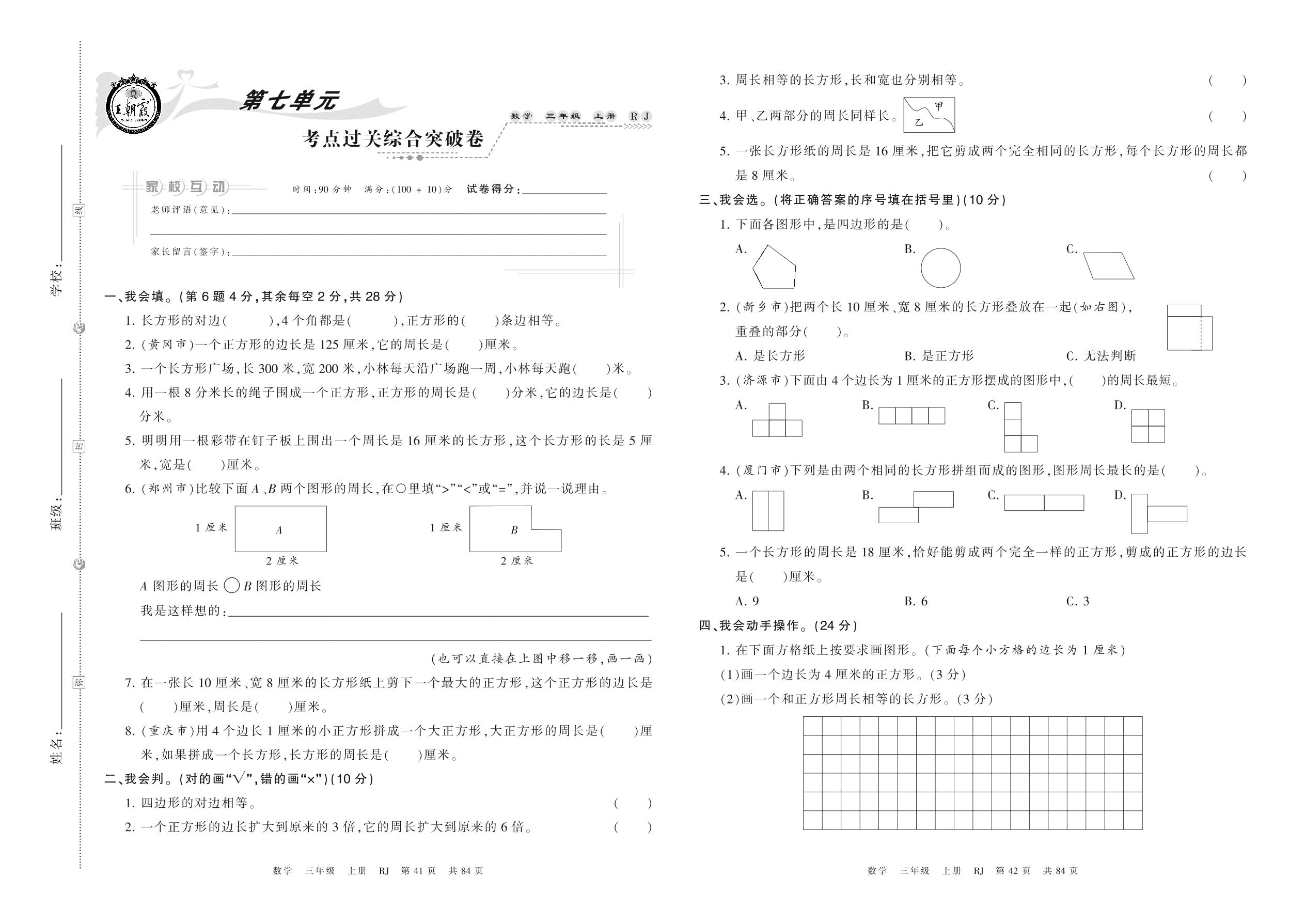 2021上册三年级数学人教版 第七单元 考点过关综合突破卷