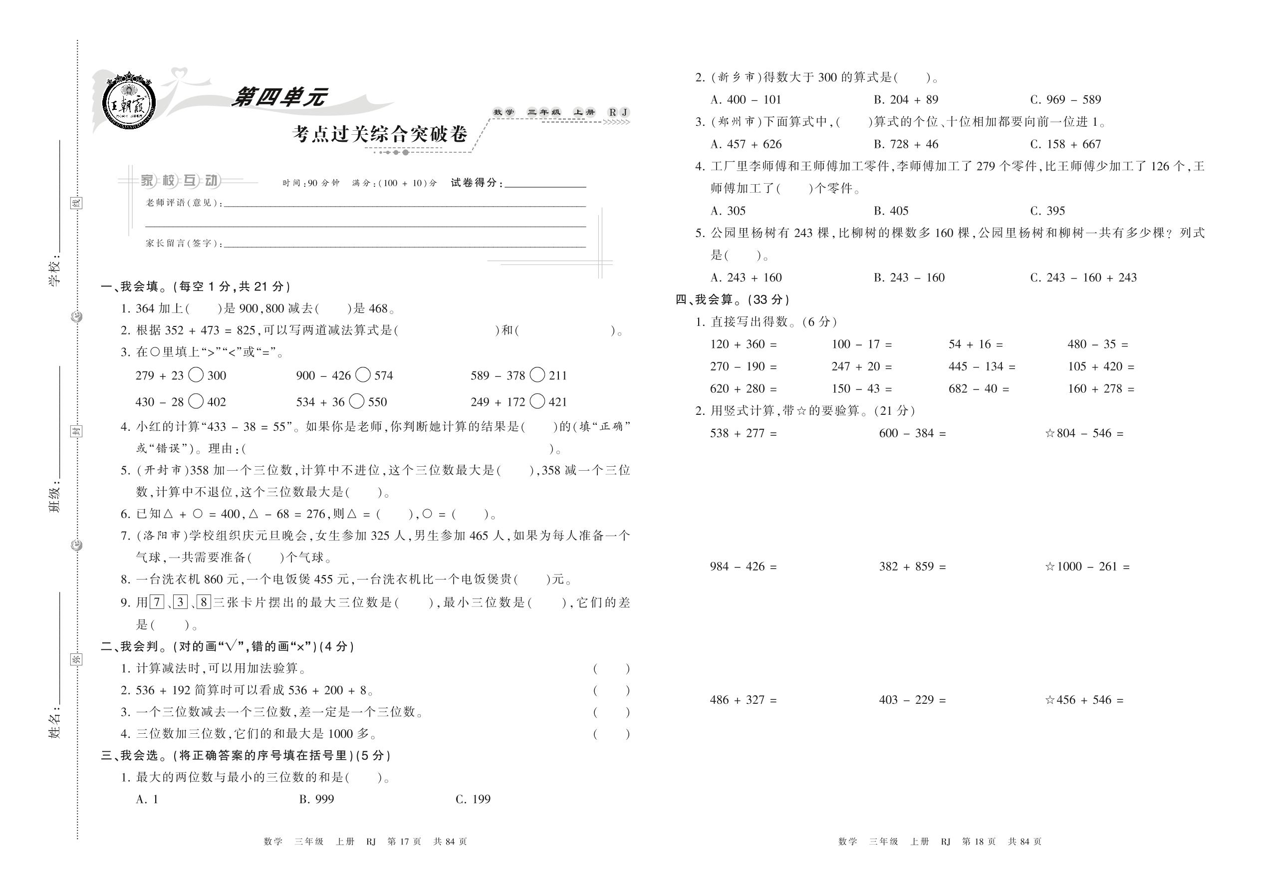2021上册三年级数学人教版 第四单元 考点过关综合突破卷