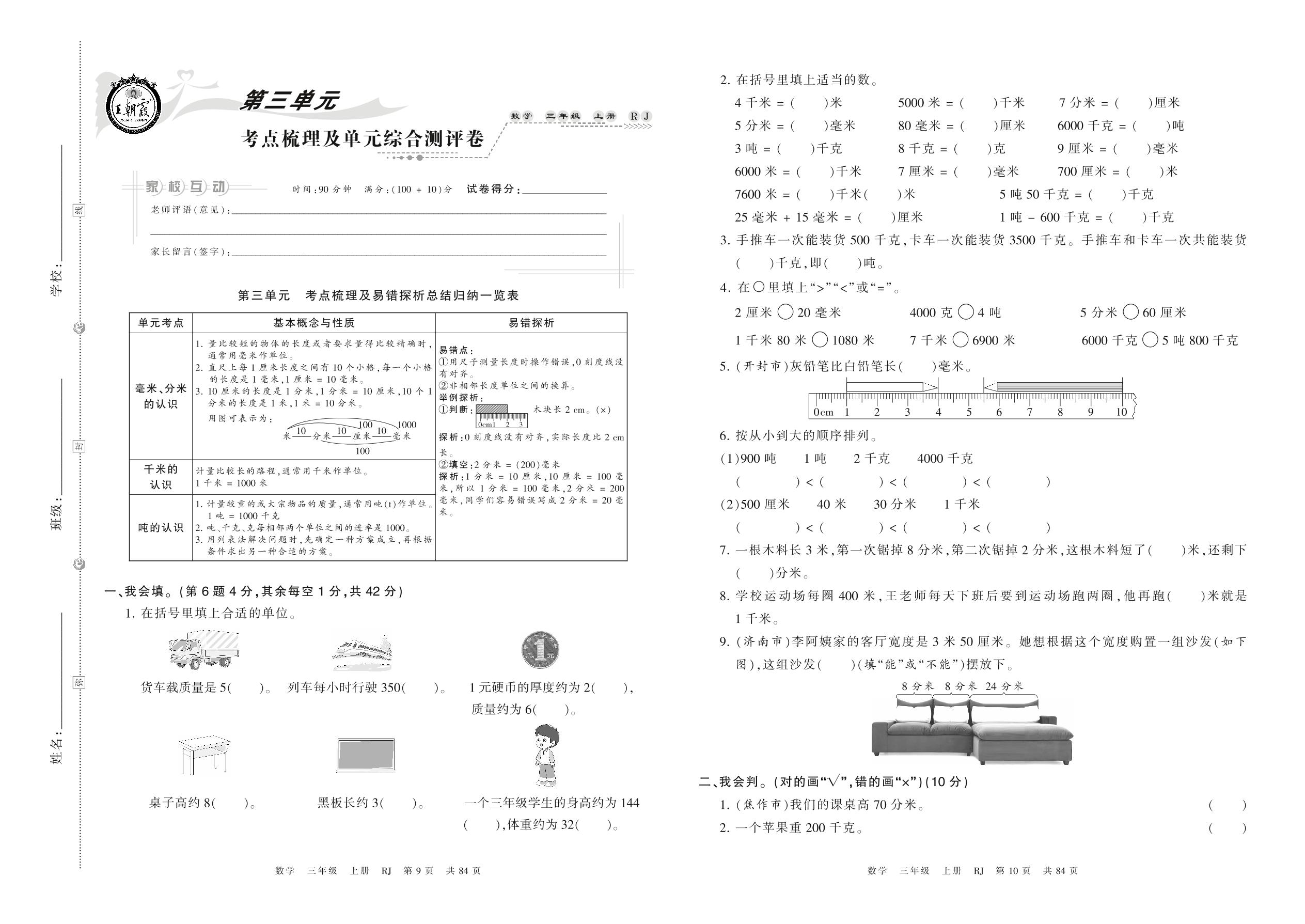 2021上册三年级数学人教版 第三单元 考点梳理及单元综合测评卷