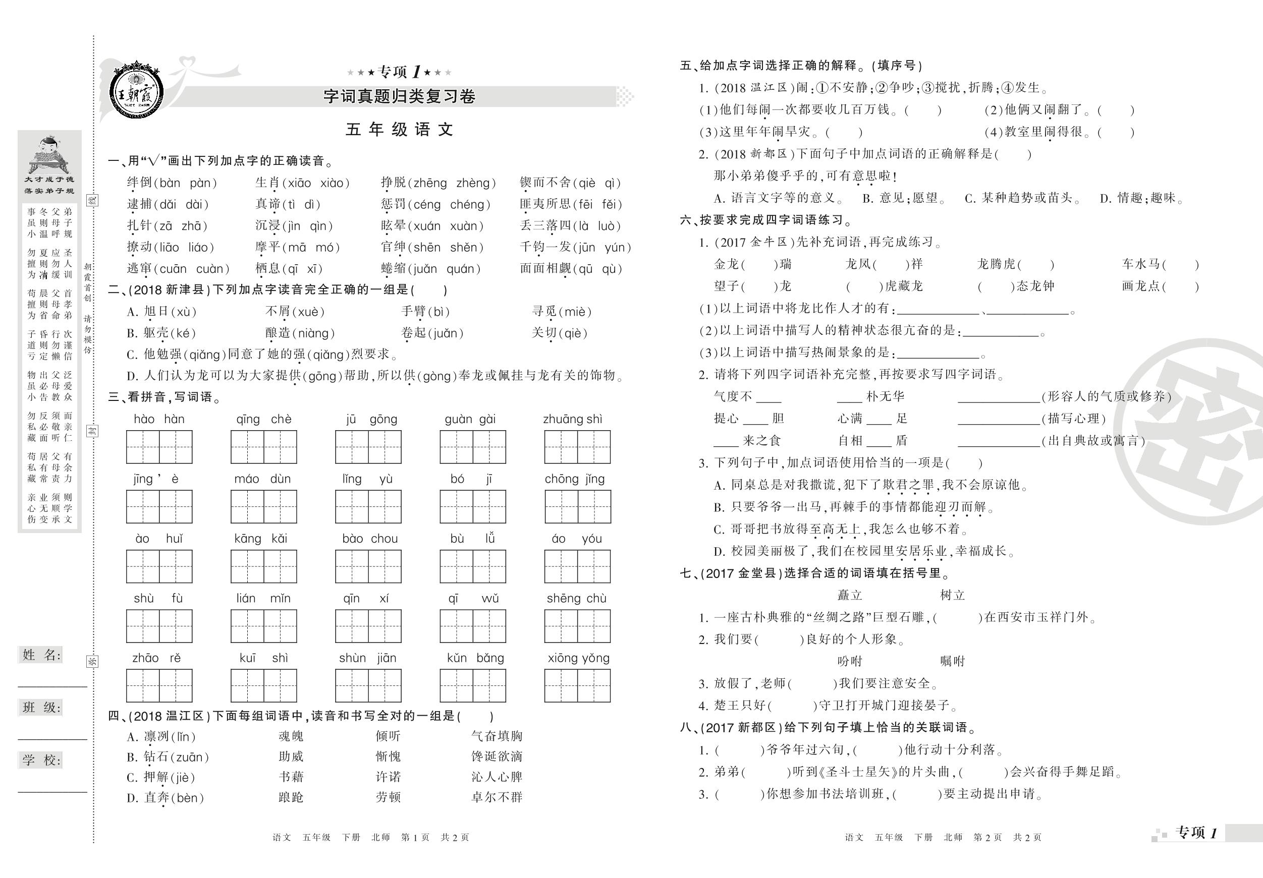 王朝霞期末专项卷——字词、句子与语言表达真题归类复习卷五年级下册语文(北师版)_R210801205509【0】