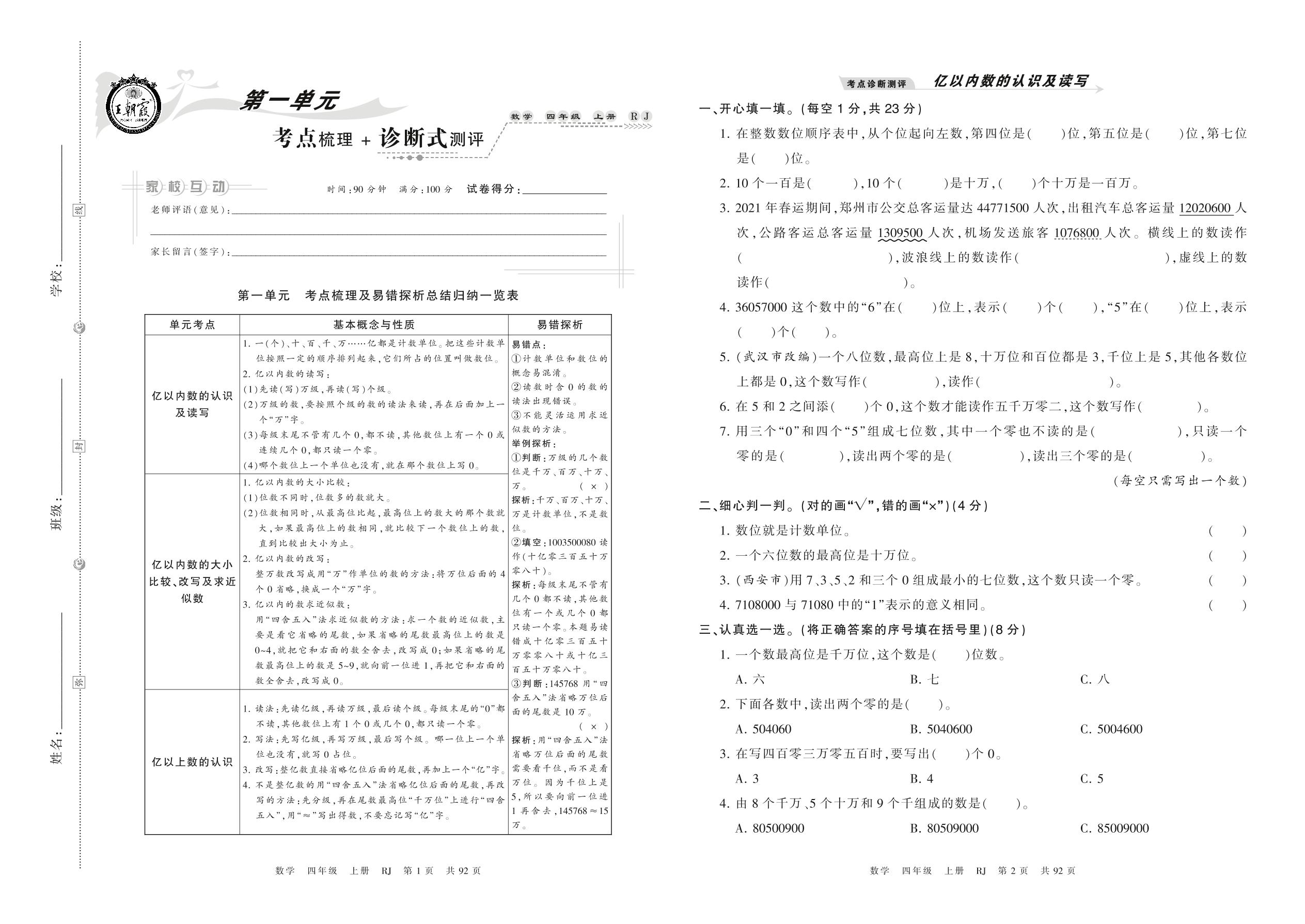 2021上册四年级数学人教版 第一单元 考点梳理 + 诊断式测评
