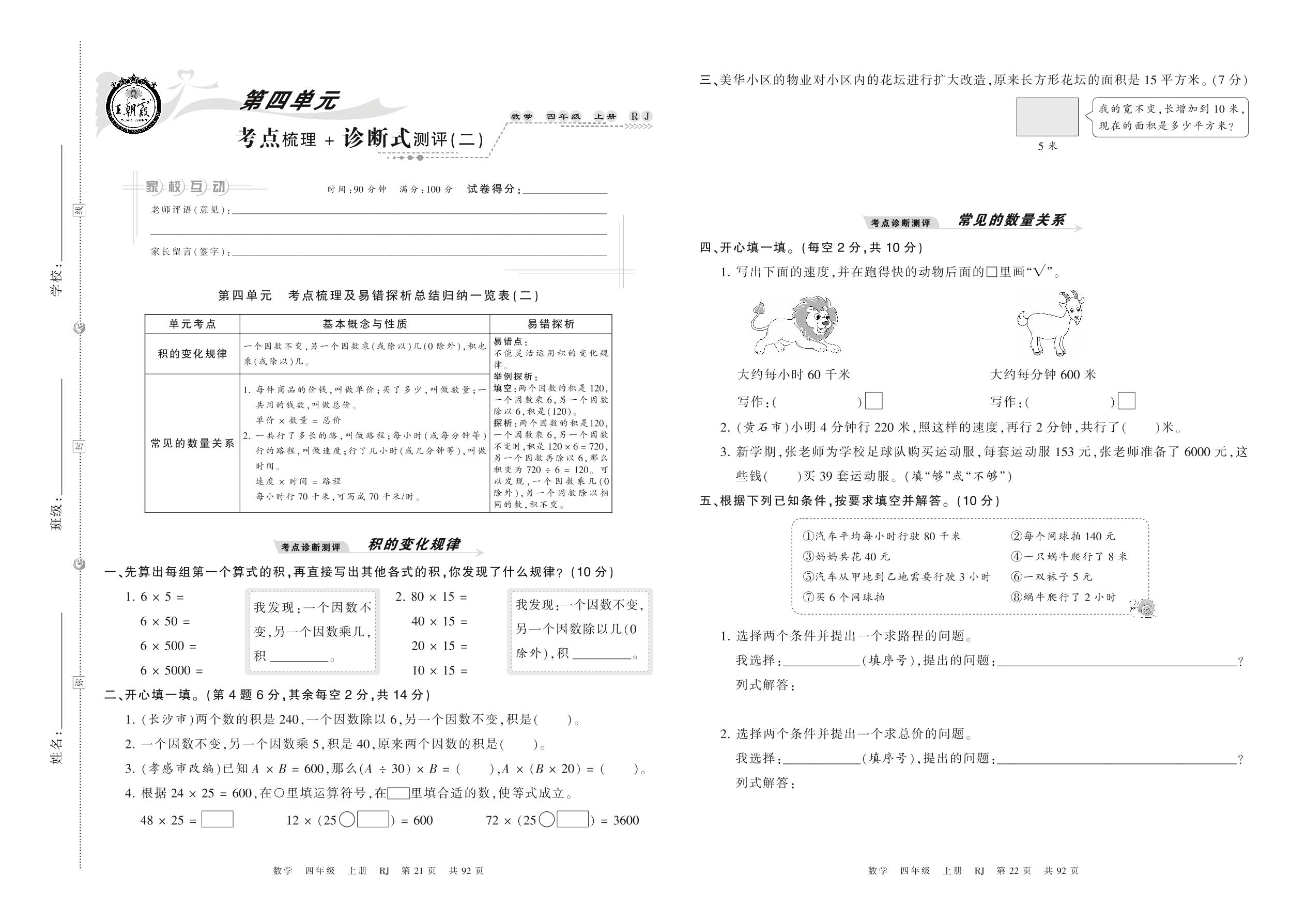2021上册四年级数学人教版 第四单元 考点梳理 + 诊断式测评(二)