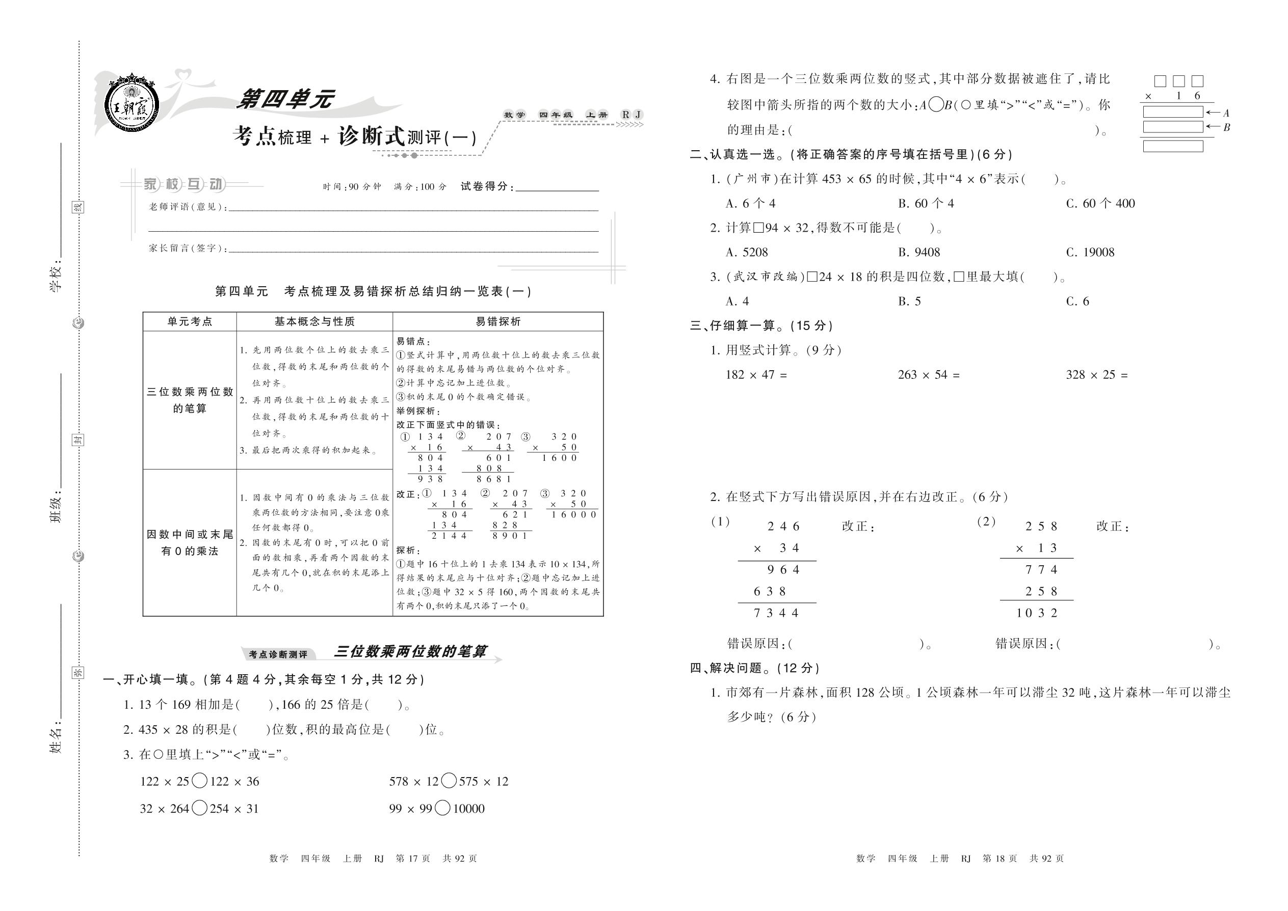 2021上册四年级数学人教版 第四单元 考点梳理 + 诊断式测评(一)