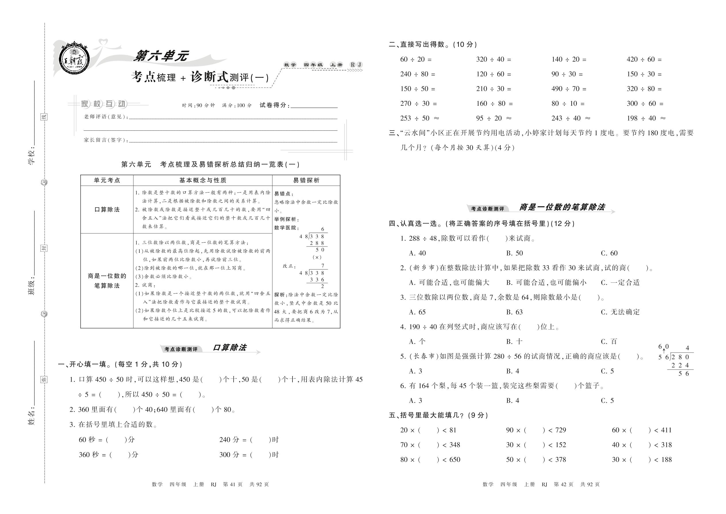 四年级数学人教版上册单元卷