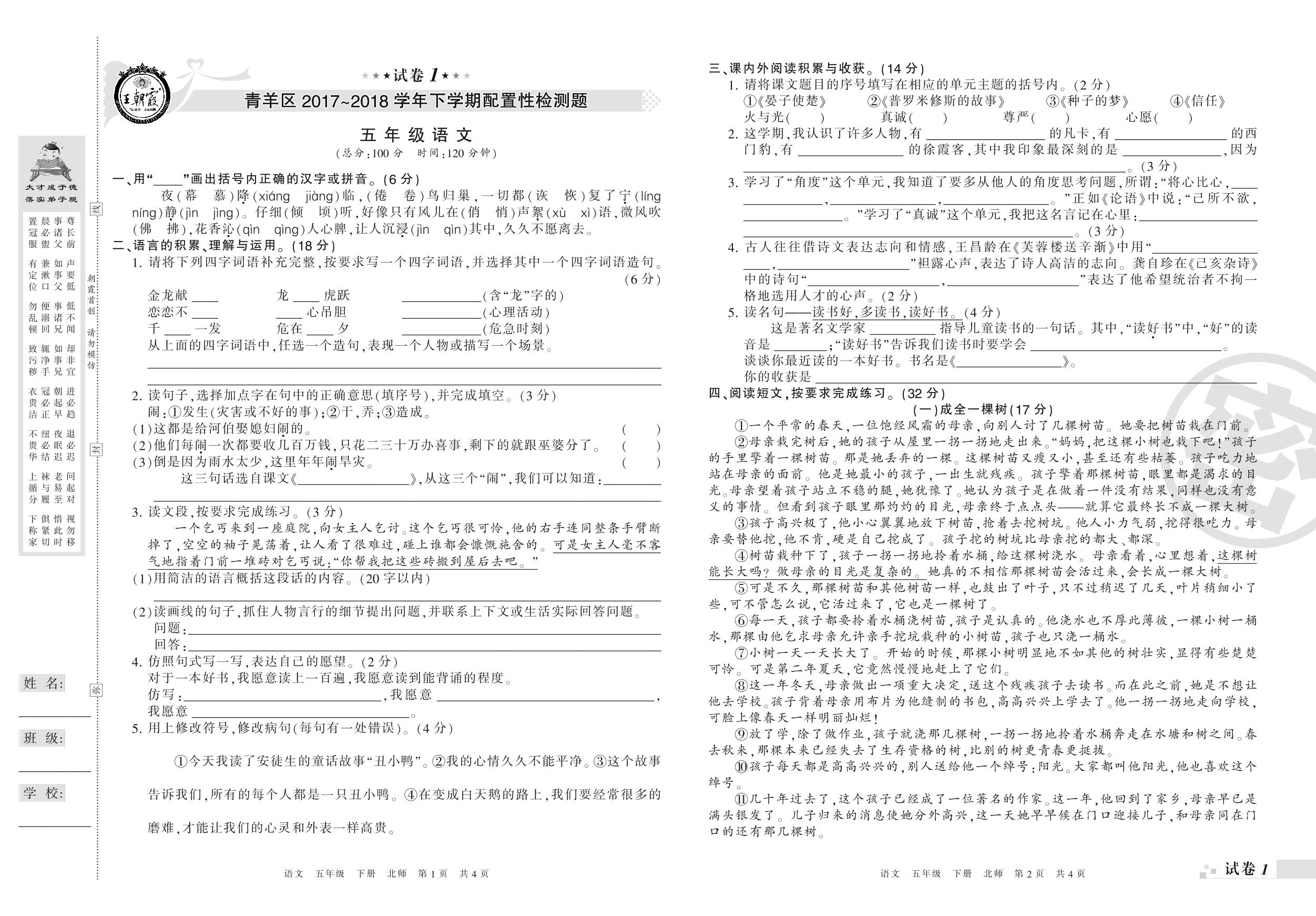 2017-2018学年第二学期成都市青羊区五年级语文试卷(北师版)【1】