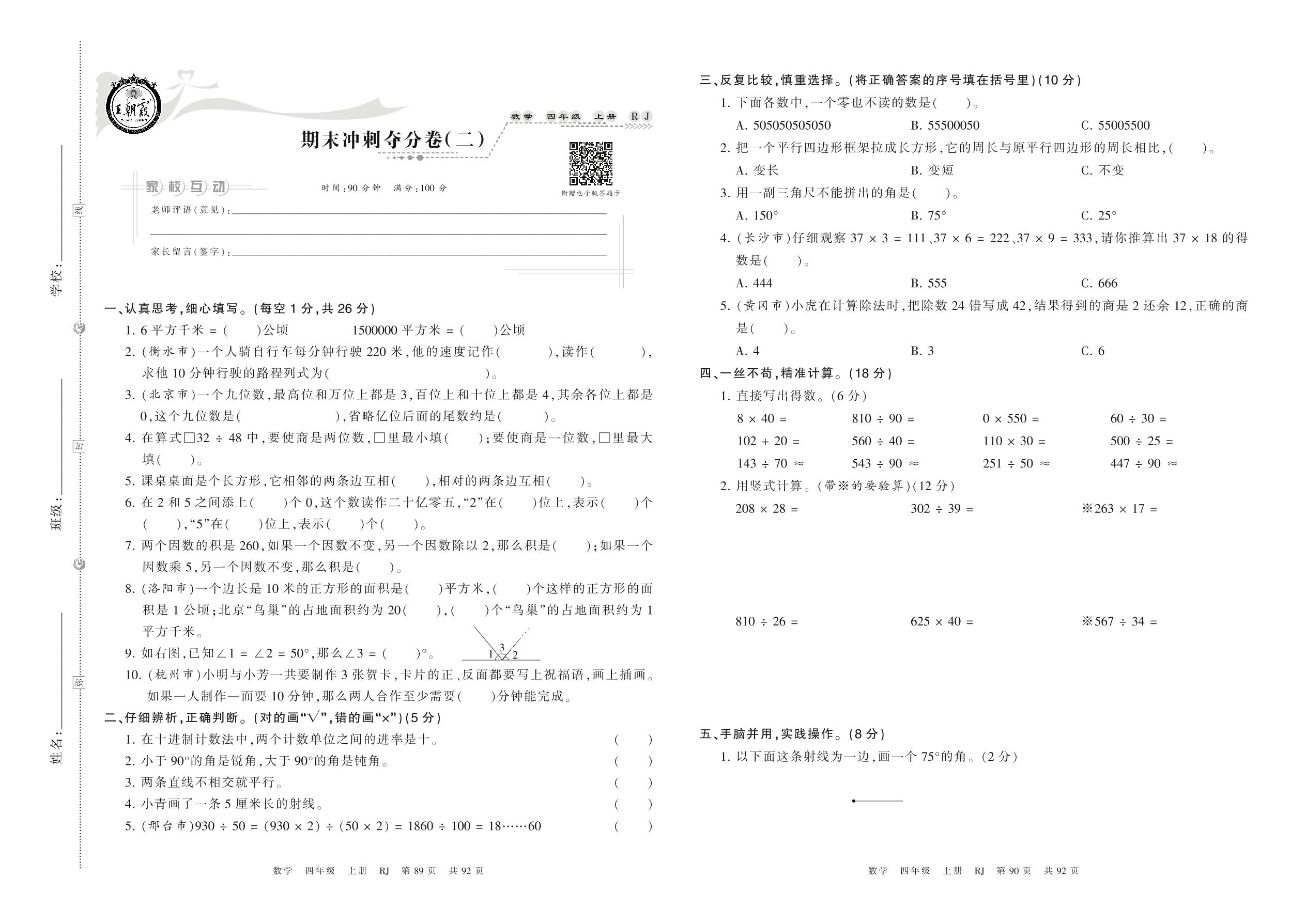 2021上册四年级数学人教版 期末冲刺夺分卷(二)