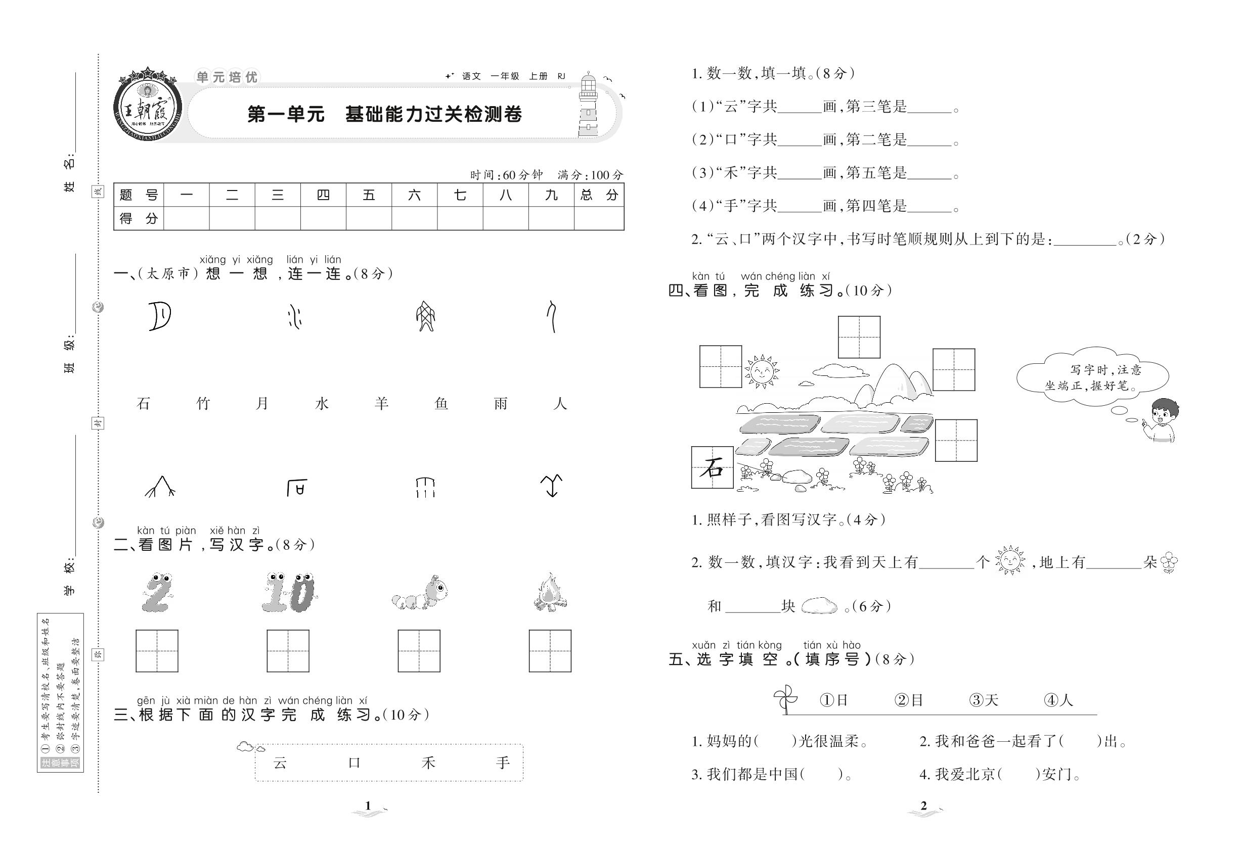 2021上册一年级语文人教版 第一单元 基础能力过关检测卷