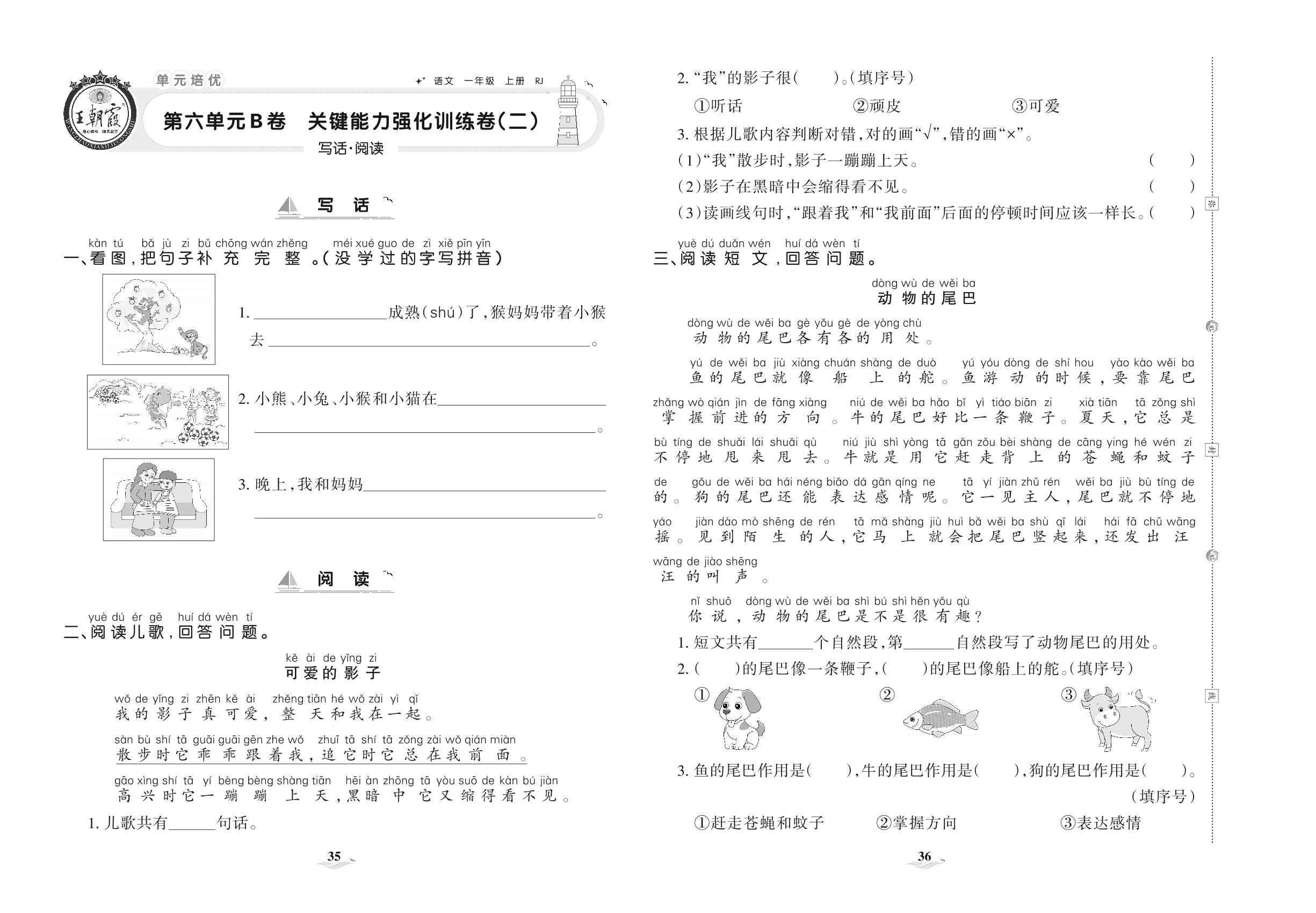 2021上册一年级语文人教版 第六单元B卷 关键能力强化训练卷(二)