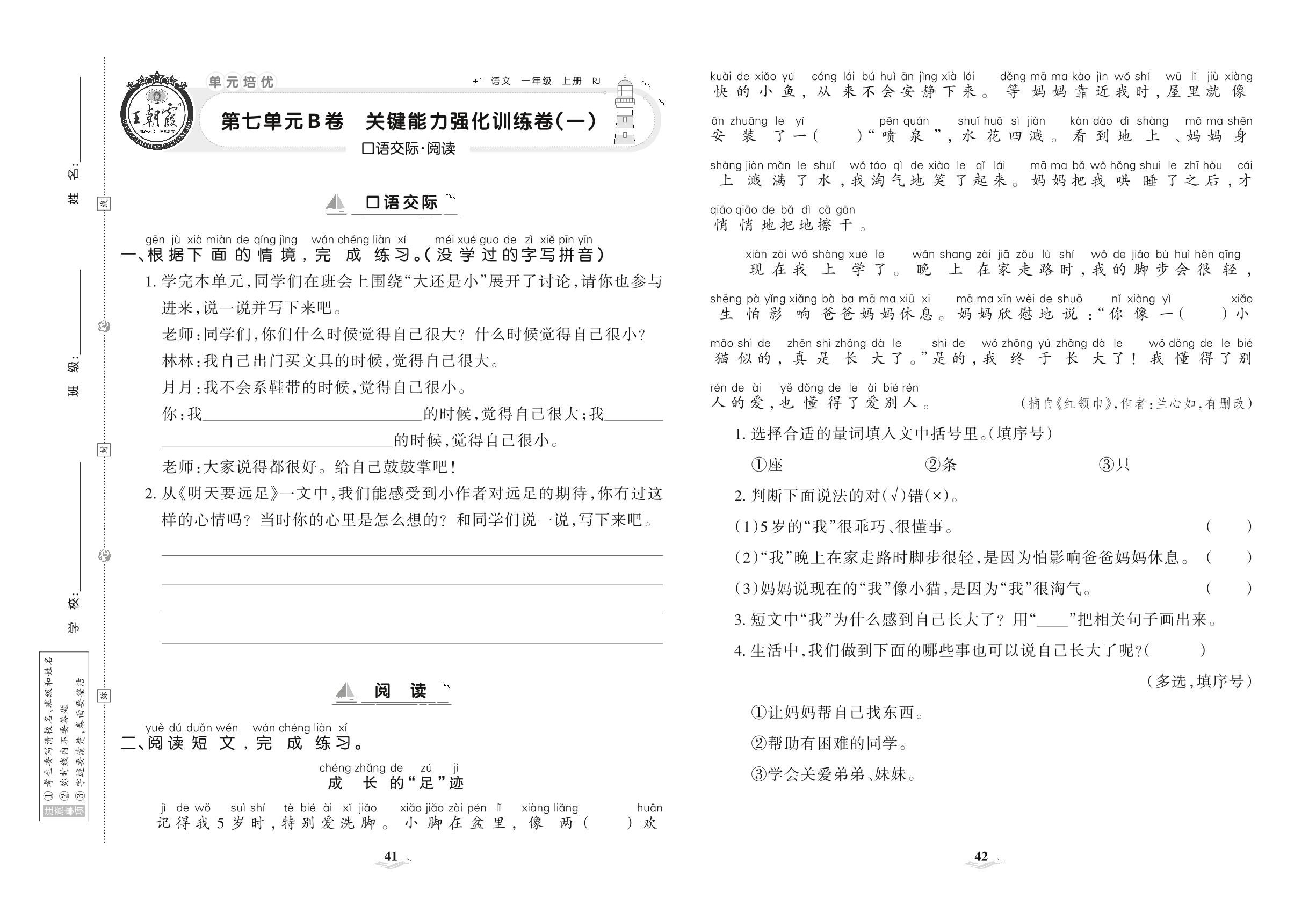 2021上册一年级语文人教版 第七单元B卷 关键能力强化训练卷(一)